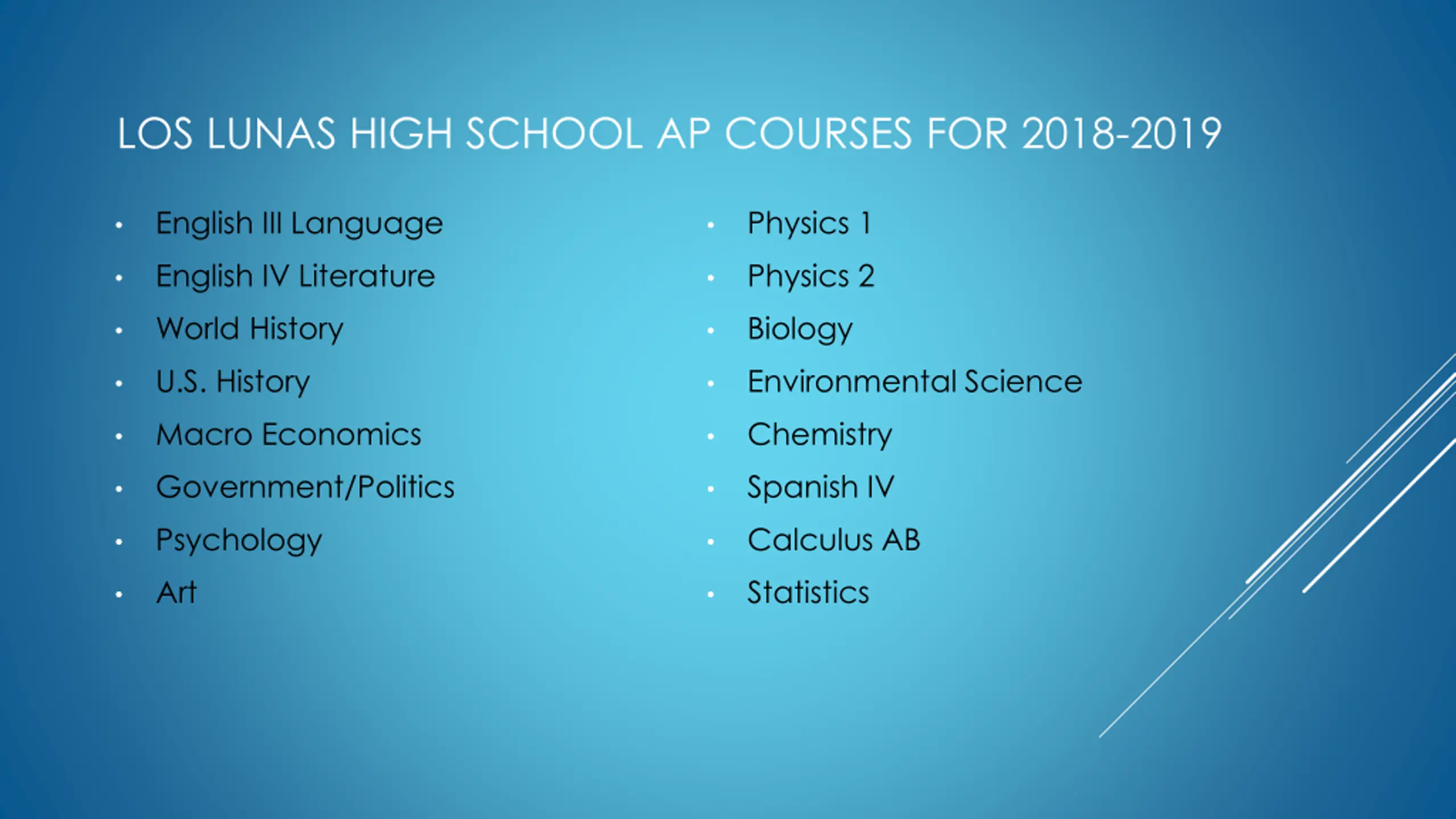 LOS LUNAS HIGH SCHOOL AP COURSES FOR 2018-2019 English III Language Physics 1 English IV Literature Physics 2 World History Biology U.S. History Environmental Science Macro Economics Chemistry Government/Politics Spanish IV Psychology Calculus AB Art Statistics