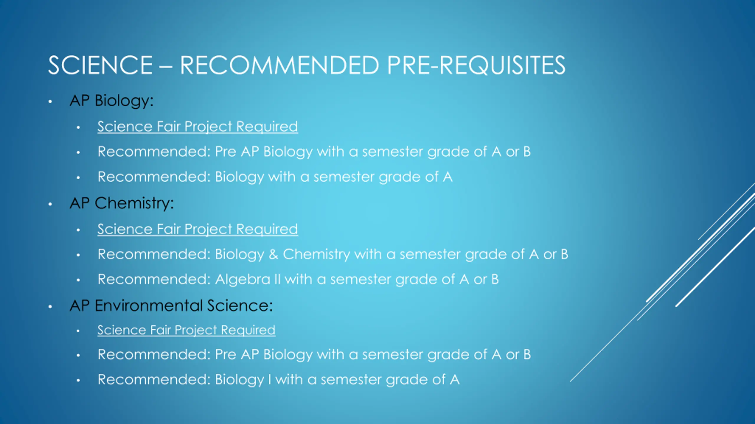 SCIENCE RECOMMENDED PRE-REQUISITES AP Biology: Science Fair Project Required Recommended: Pre AP Biology with a semester grade of A or B Recommended: Biology with a semester grade of A AP Chemistry: Science Fair Project Required Recommended: Biology & Chemistry with a semester grade of A or B Recommended: Algebra II with a semester grade of A or B AP Environmental Science: Science Fair Project Required Recommended: Pre AP Biology with a semester grade of A or B Recommended: Biology I with a semester grade of A