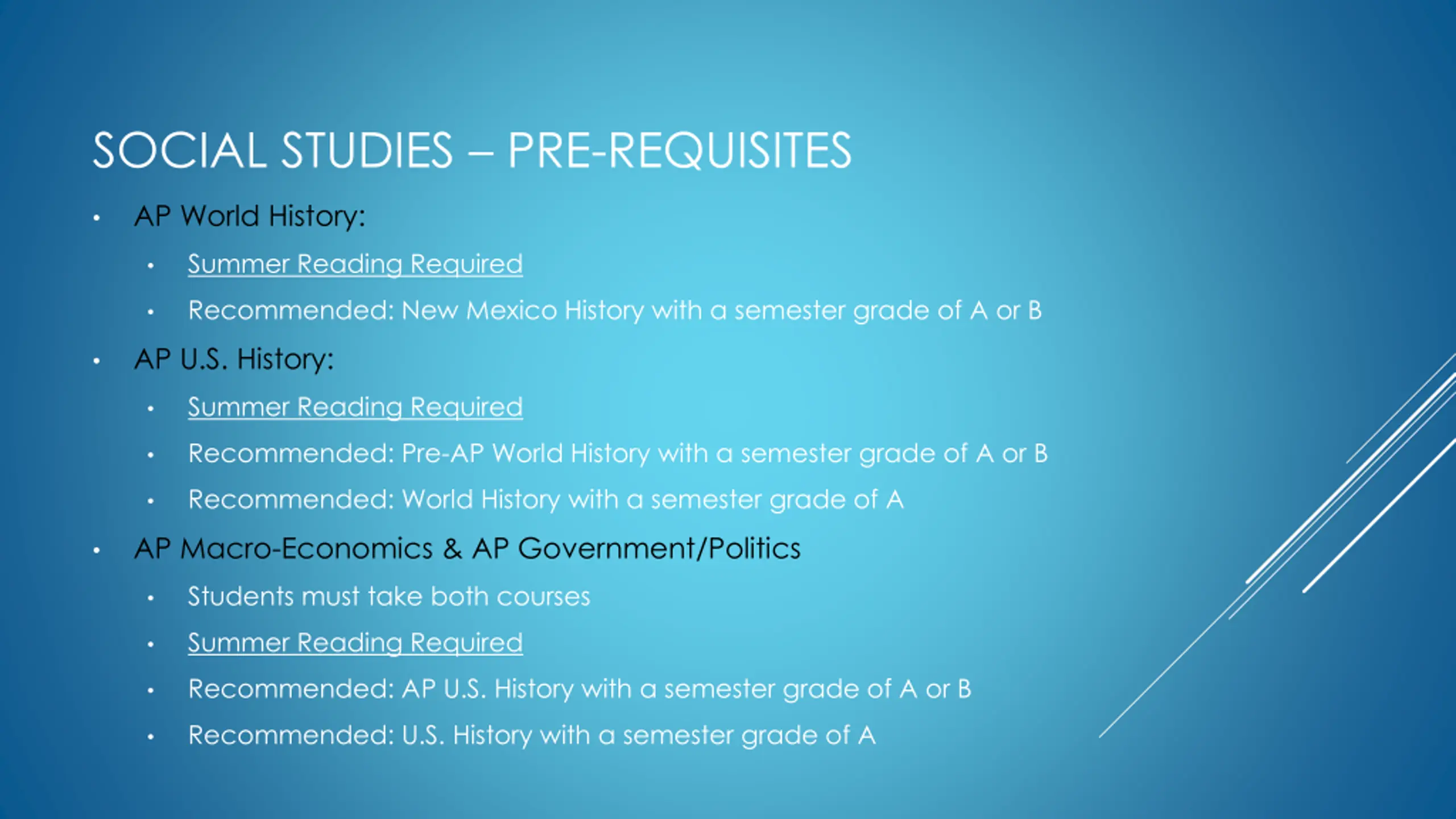 SOCIAL STUDIES PRE-REQUISITES AP World History: Summer Reading Required Recommended: New Mexico History with a semester grade of A or B AP U.S. History: Summer Reading Required Recommended: Pre-AP World History with a semester grade of A or B Recommended: World History with a semester grade of A AP Macro-Economics & AP Government/Politics Students must take both courses Summer Reading Required Recommended: AP U.S. History with a semester grade of A or B Recommended: U.S. History with a semester grade of A