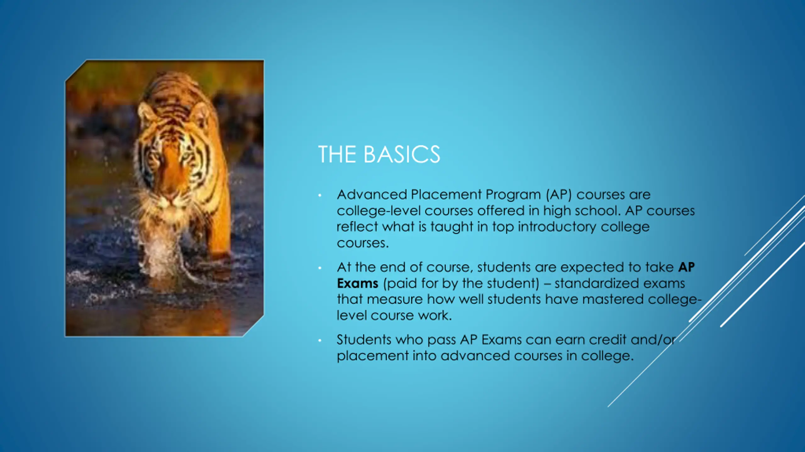 THE BASICS Advanced Placement Program (AP) courses are college-level courses offered in high school. AP courses reflect what is taught in top introductory college courses. At the end of course, students are expected to take AP Exams (paid for by the student) standardized exams that measure how well students have mastered college- level course work. Students who pass AP Exams can earn credit and/or placement into advanced courses in college.