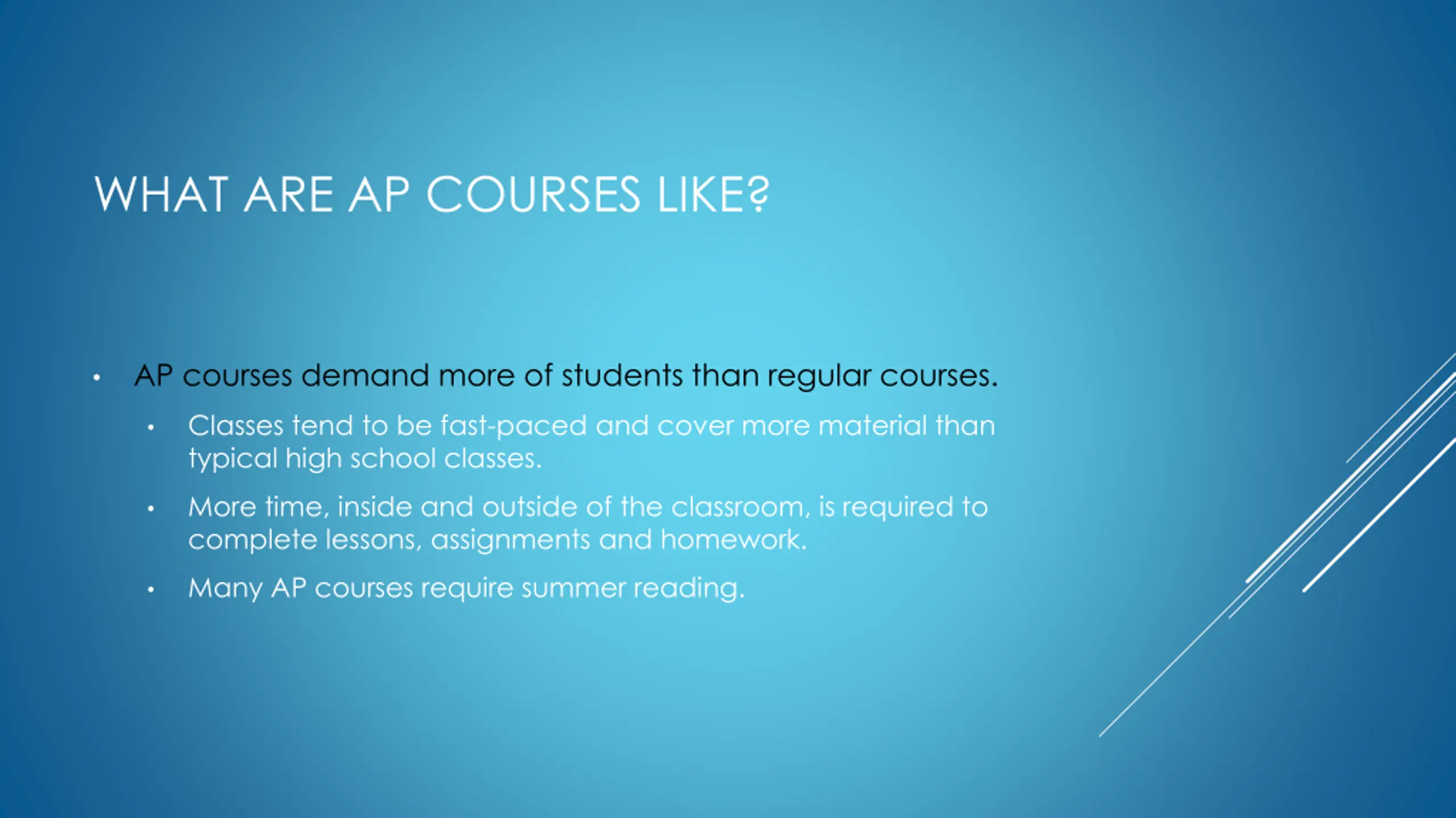 WHAT ARE AP COURSES LIKE? AP courses demand more of students than regular courses. Classes tend to be fast-paced and cover more material than typical high school classes. More time, inside and outside of the classroom, is required to complete lessons, assignments and homework. Many AP courses require summer reading.