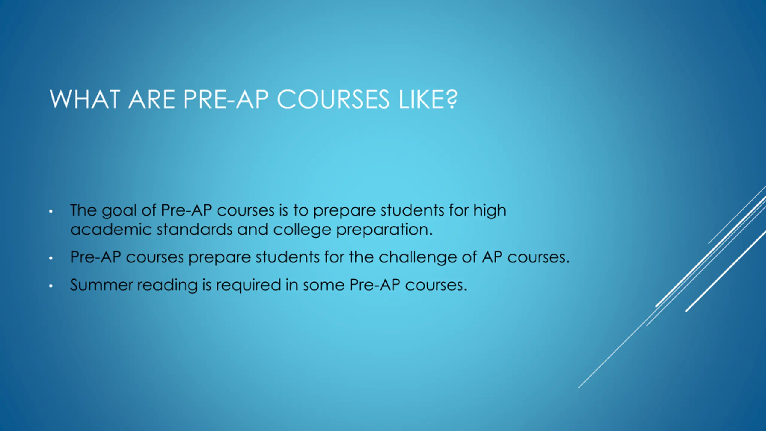 WHAT ARE PRE-AP COURSES LIKE? The goal of Pre-AP courses is to prepare students for high academic standards and college preparation. Pre-AP courses prepare students for the challenge of AP courses. Summer reading is required in some Pre-AP courses.