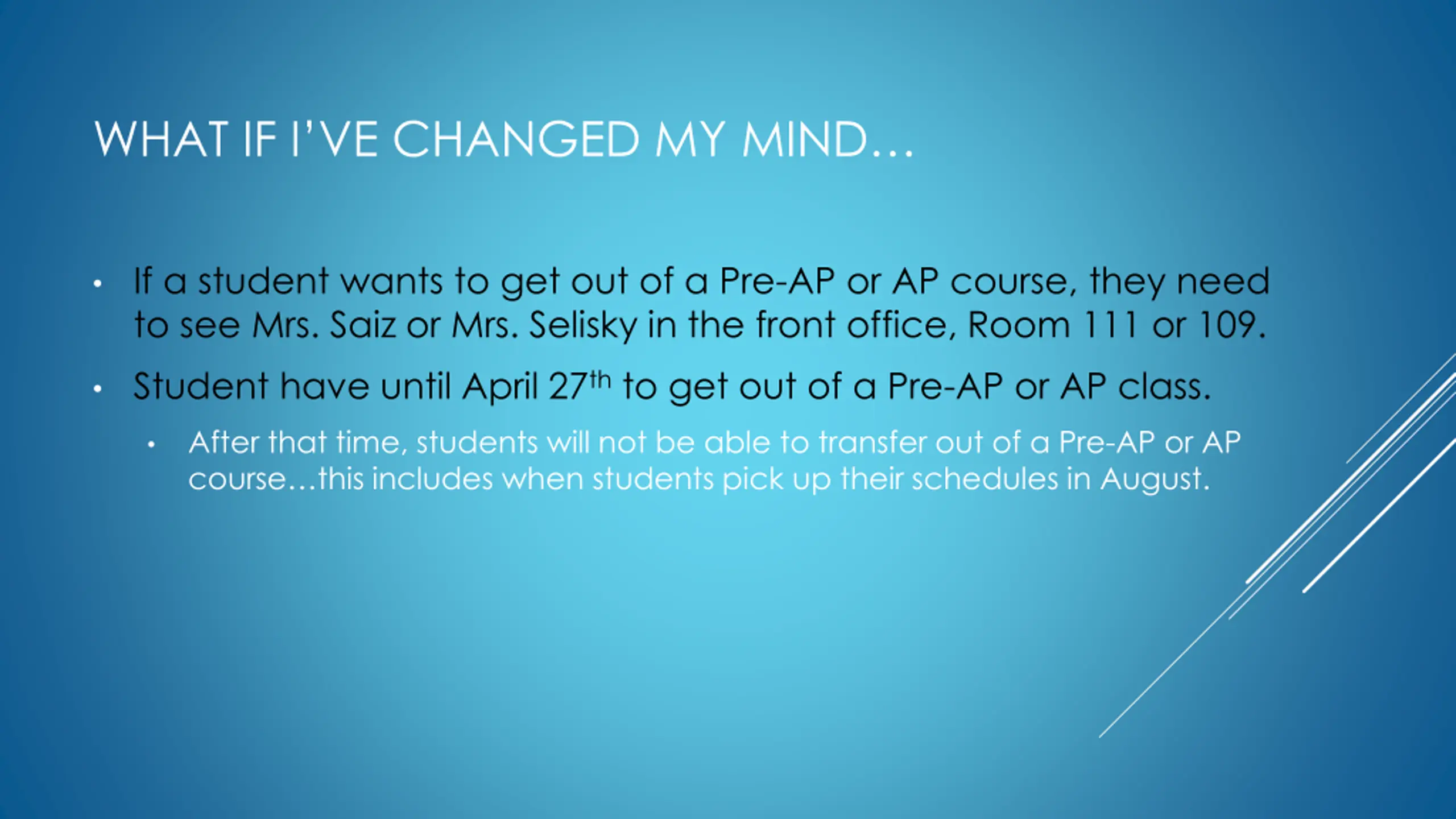 WHAT IF IVE CHANGED MY MIND If a student wants to get out of a Pre-AP or AP course, they need to see Mrs. Saiz or Mrs. Selisky in the front office, Room 111 or 109. Student have until April 27thto get out of a Pre-AP or AP class. After that time, students will not be able to transfer out of a Pre-AP or AP course this includes when students pick up their schedules in August.