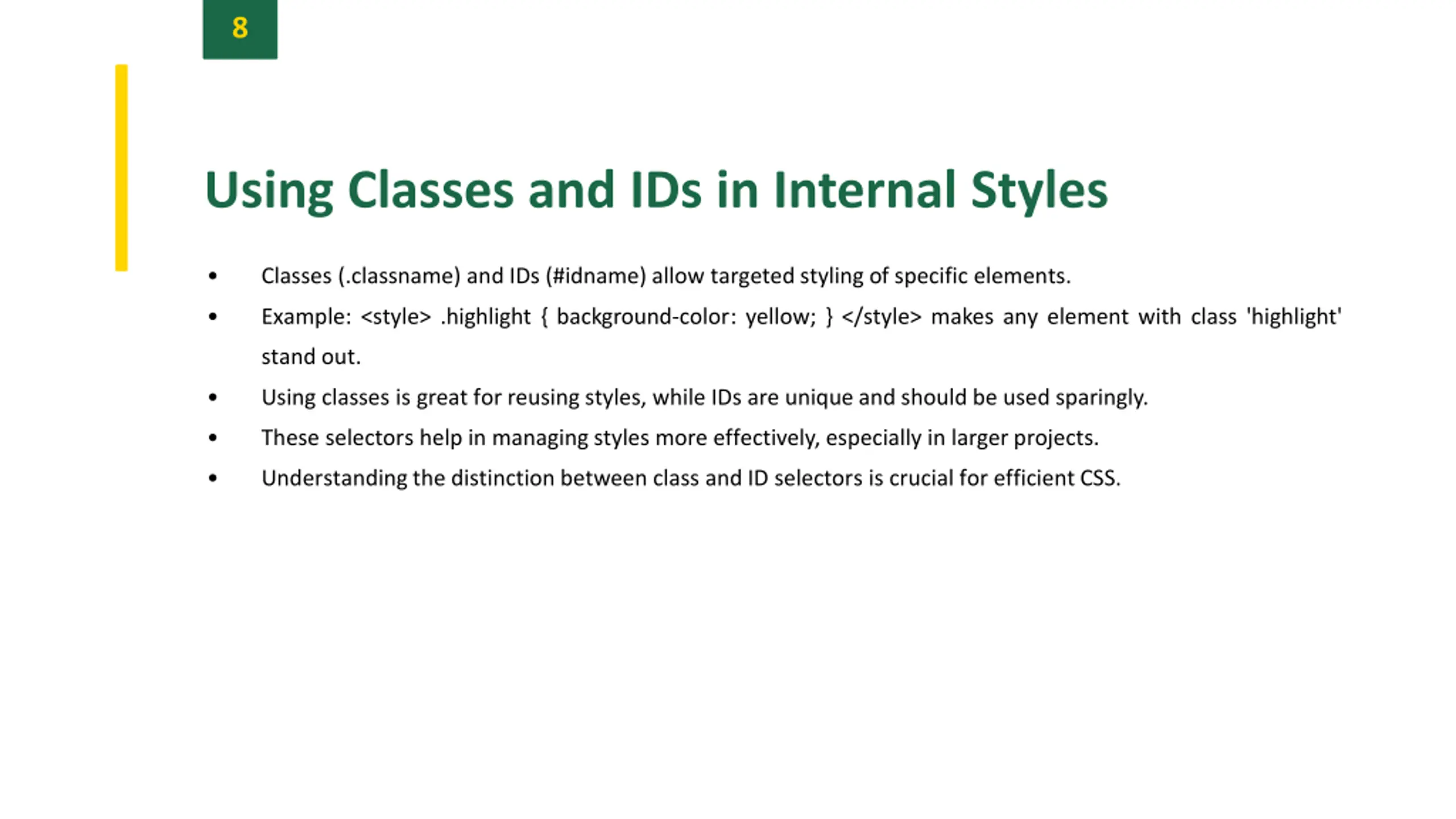 8 Using Classes and IDs in Internal Styles Classes (.classname) and IDs (#idname) allow targeted styling of specific elements. Example: <style> .highlight { background-color: yellow; } </style> makes any element with class 'highlight' stand out. Using classes is great for reusing styles, while IDs are unique and should be used sparingly. These selectors help in managing styles more effectively, especially in larger projects. Understanding the distinction between class and ID selectors is crucial for efficient CSS.