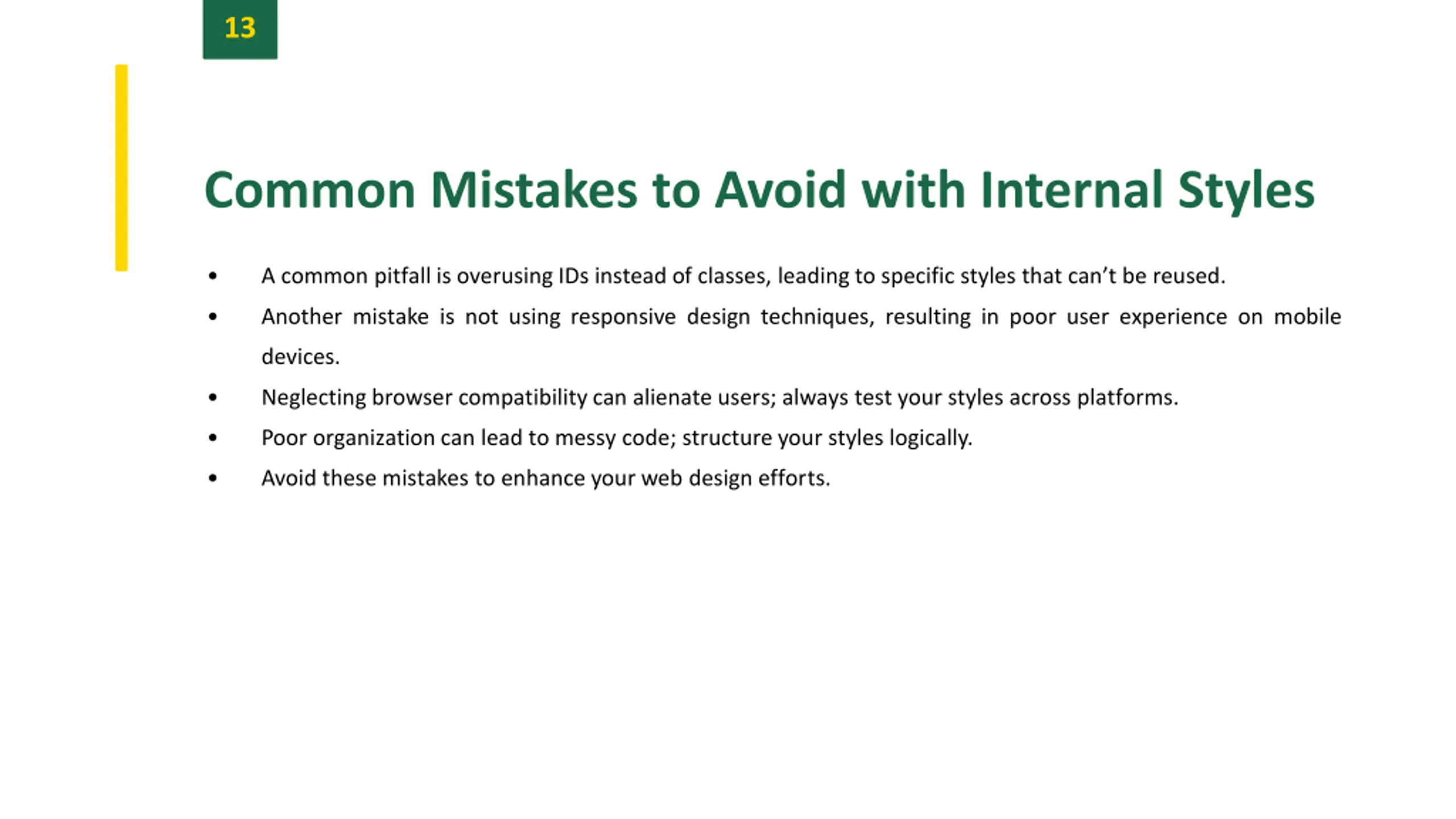 13 Common Mistakes to Avoid with Internal Styles A common pitfall is overusing IDs instead of classes, leading to specific styles that can t be reused. Another mistake is not using responsive design techniques, resulting in poor user experience on mobile devices. Neglecting browser compatibility can alienate users; always test your styles across platforms. Poor organizationcan lead to messy code; structure your styles logically. Avoid these mistakes to enhance your web design efforts.