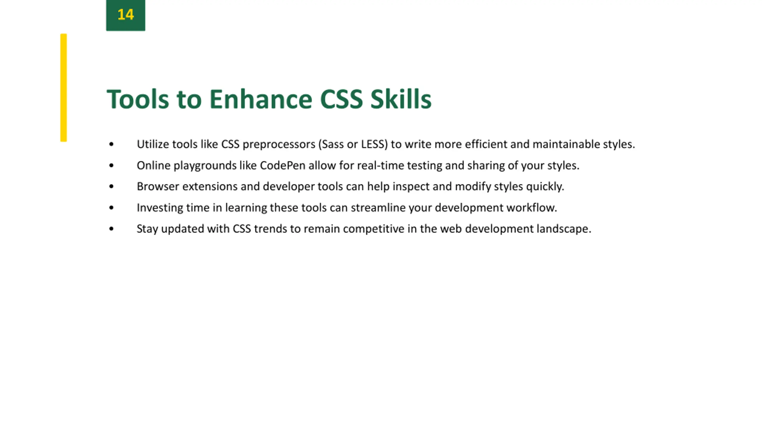 14 Tools to Enhance CSS Skills Utilize tools like CSS preprocessors (Sass or LESS) to write more efficient and maintainable styles. Online playgroundslike CodePen allow for real-time testing and sharing of your styles. Browser extensions and developer tools can help inspect and modify styles quickly. Investing time in learning these tools can streamline your development workflow. Stay updatedwith CSS trends to remain competitive in the web development landscape.