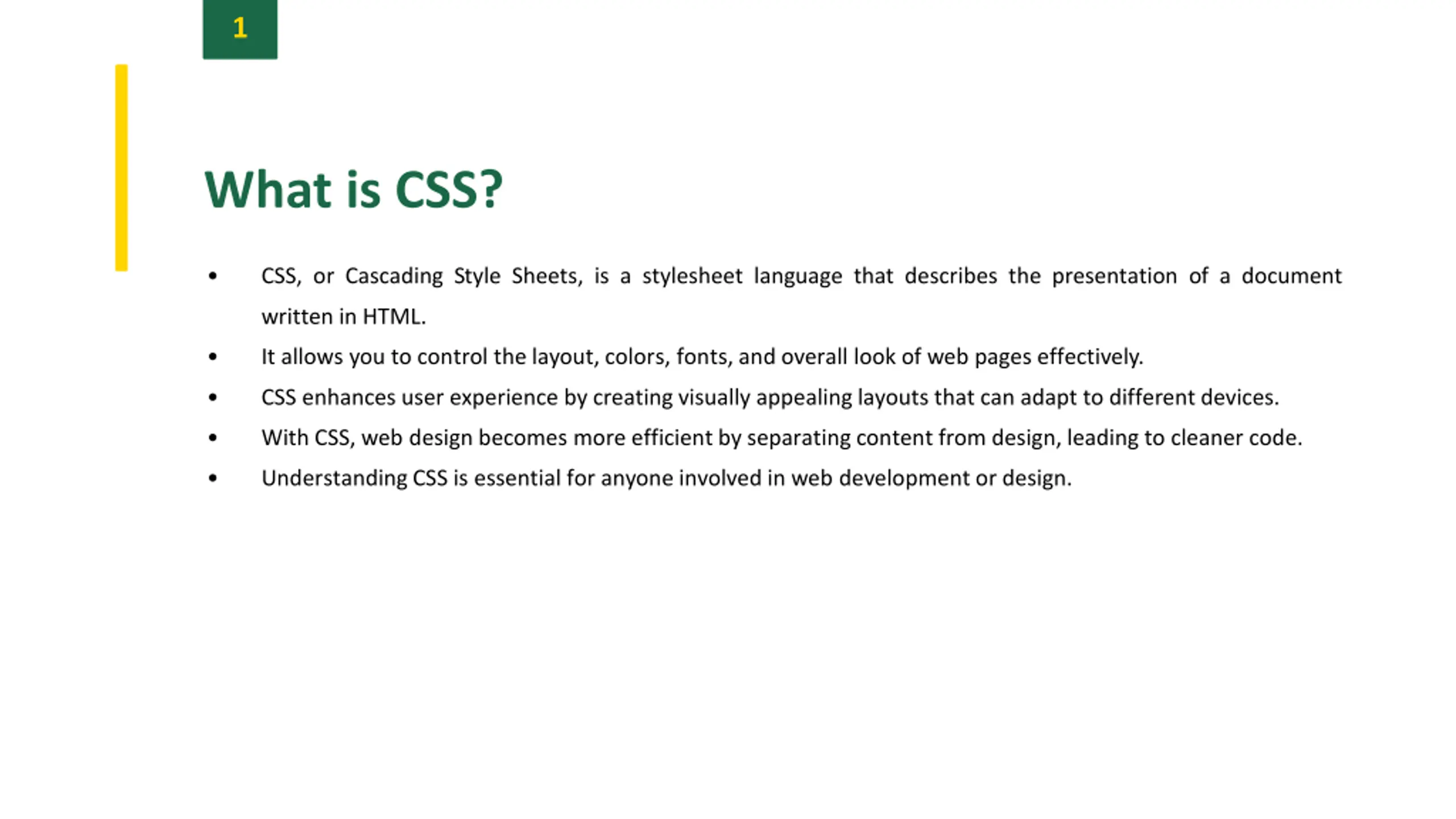 1 What is CSS? CSS, or Cascading Style Sheets, is a stylesheet language that describes the presentation of a document written in HTML. It allows you to control the layout, colors, fonts, and overall look of web pages effectively. CSS enhances user experience by creating visually appealing layouts that can adapt to different devices. With CSS, web design becomes more efficient by separating content from design, leading to cleaner code. Understanding CSS is essential for anyone involved in web development or design.
