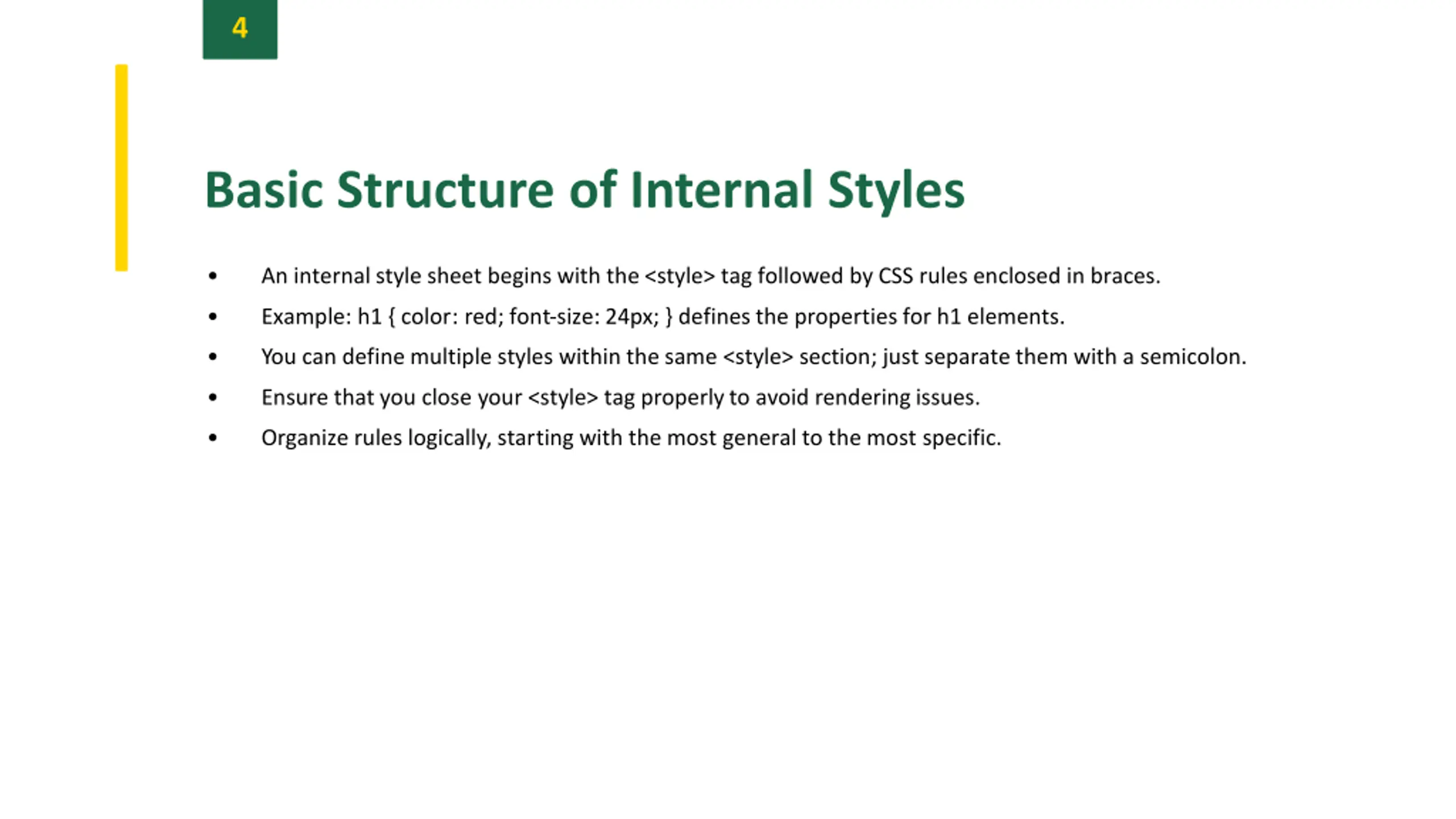 4 Basic Structure of Internal Styles An internal style sheet begins with the <style> tag followed by CSS rules enclosed in braces. Example: h1 { color: red; font-size: 24px; } defines the properties for h1 elements. You can define multiple styles within the same <style> section; just separate them with a semicolon. Ensure that you close your <style> tag properlyto avoid renderingissues. Organize rules logically, starting with the most general to the most specific.