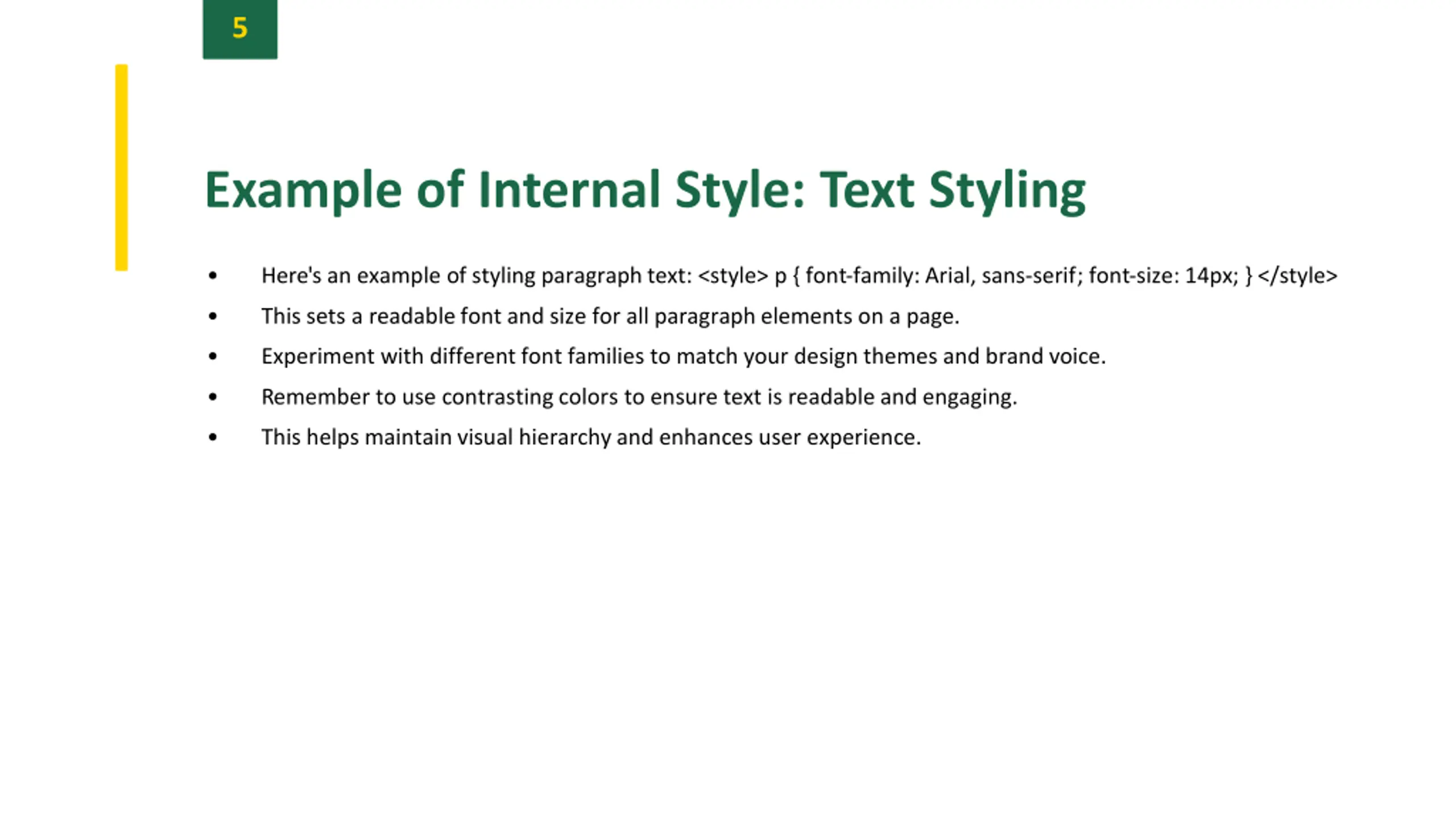 5 Example of Internal Style: Text Styling Here's an example of styling paragraphtext: <style> p { font-family: Arial, sans-serif; font-size: 14px; } </style> This sets a readablefont and size for all paragraphelements on a page. Experiment with different font families to match your design themes and brand voice. Remember to use contrasting colors to ensure text is readable and engaging. This helps maintain visual hierarchy and enhances user experience.
