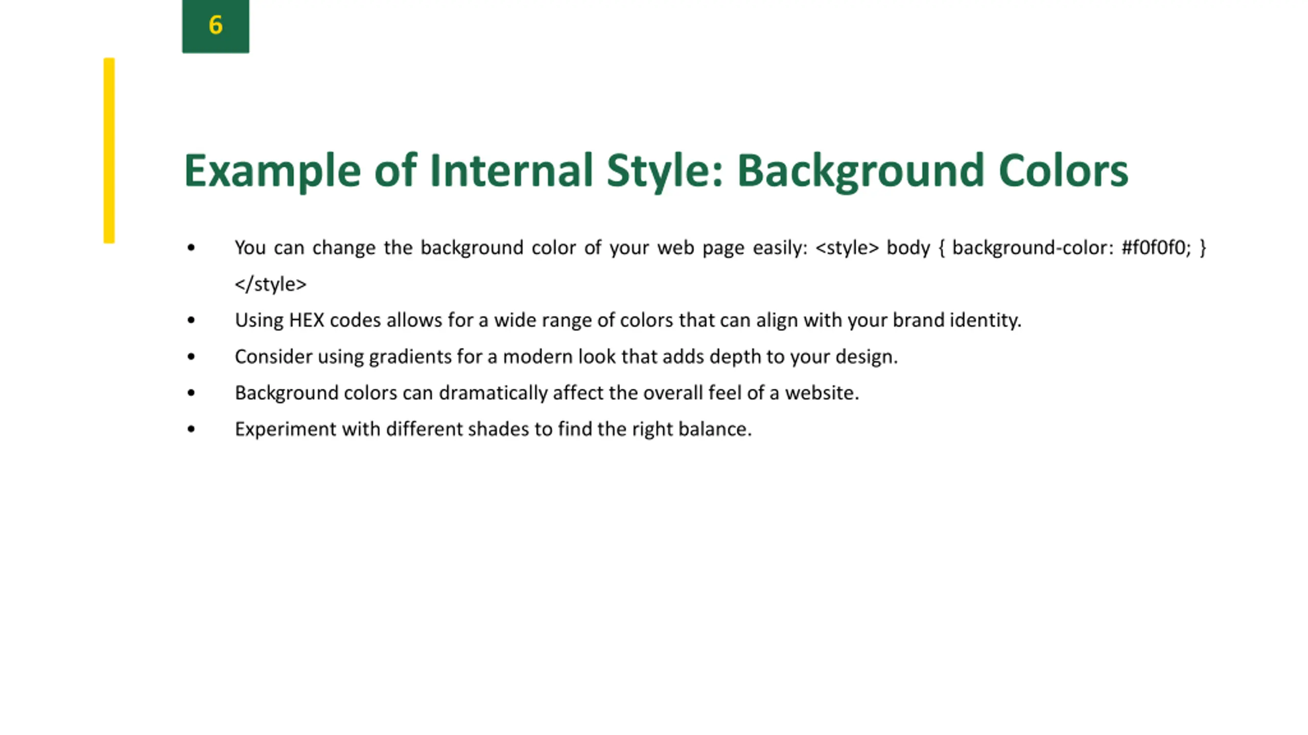 6 Example of Internal Style: Background Colors You can change the background color of your web page easily: <style> body { background-color: #f0f0f0; } </style> Using HEX codes allows for a wide range of colors that can align with your brand identity. Consider using gradients for a modern look that adds depthto your design. Background colors can dramatically affect the overall feel of a website. Experiment with different shades to find the right balance.