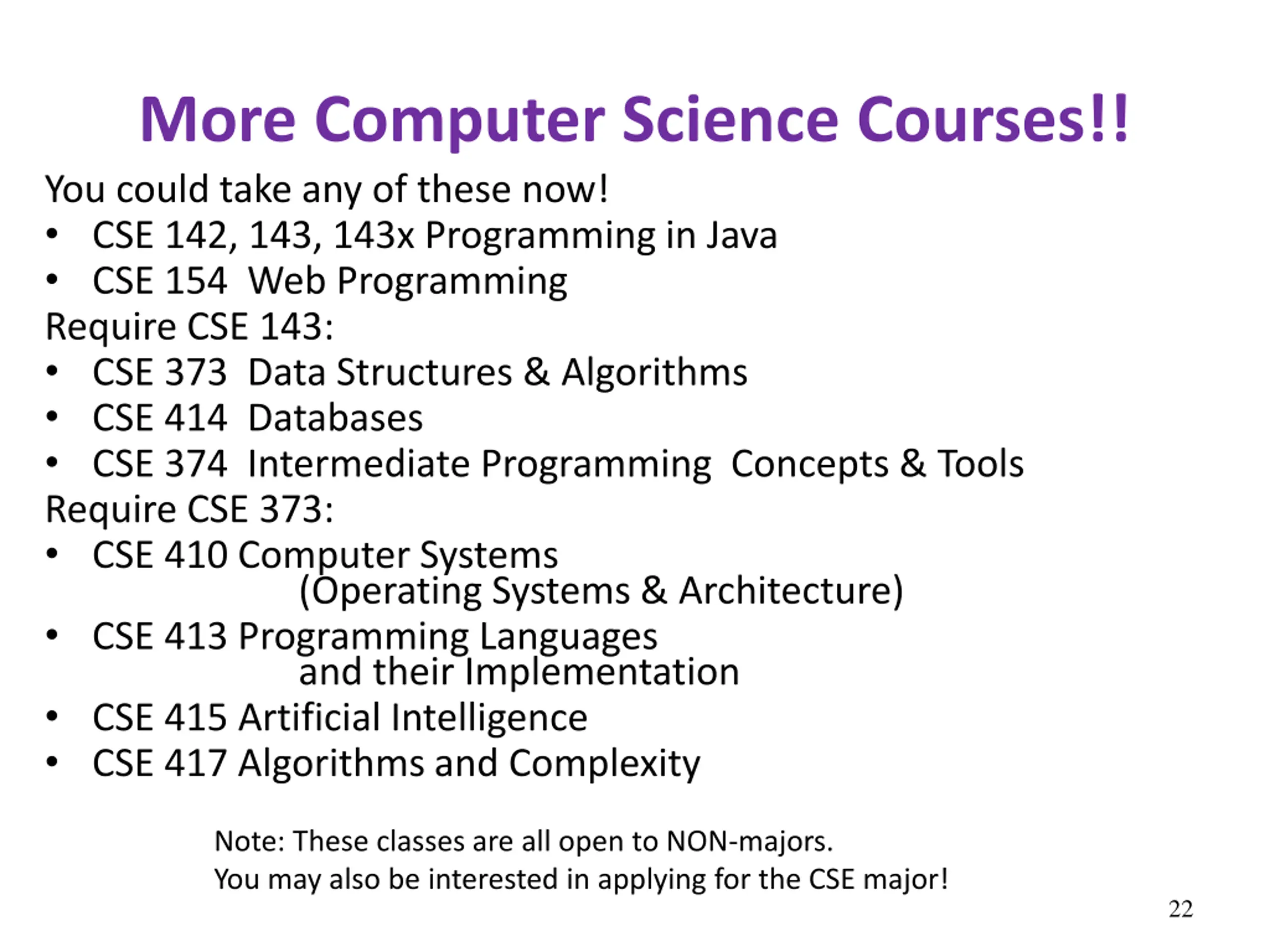 More Computer Science Courses!! You could take any of these now! CSE 142, 143, 143x Programming in Java CSE 154 Web Programming Require CSE 143: CSE 373 Data Structures & Algorithms CSE 414 Databases CSE 374 Intermediate Programming Concepts & Tools Require CSE 373: CSE 410 Computer Systems (Operating Systems & Architecture) CSE 413 Programming Languages and their Implementation CSE 415 Artificial Intelligence CSE 417 Algorithms and Complexity Note: These classes are all open to NON-majors. You may also be interested in applying for the CSE major! 22