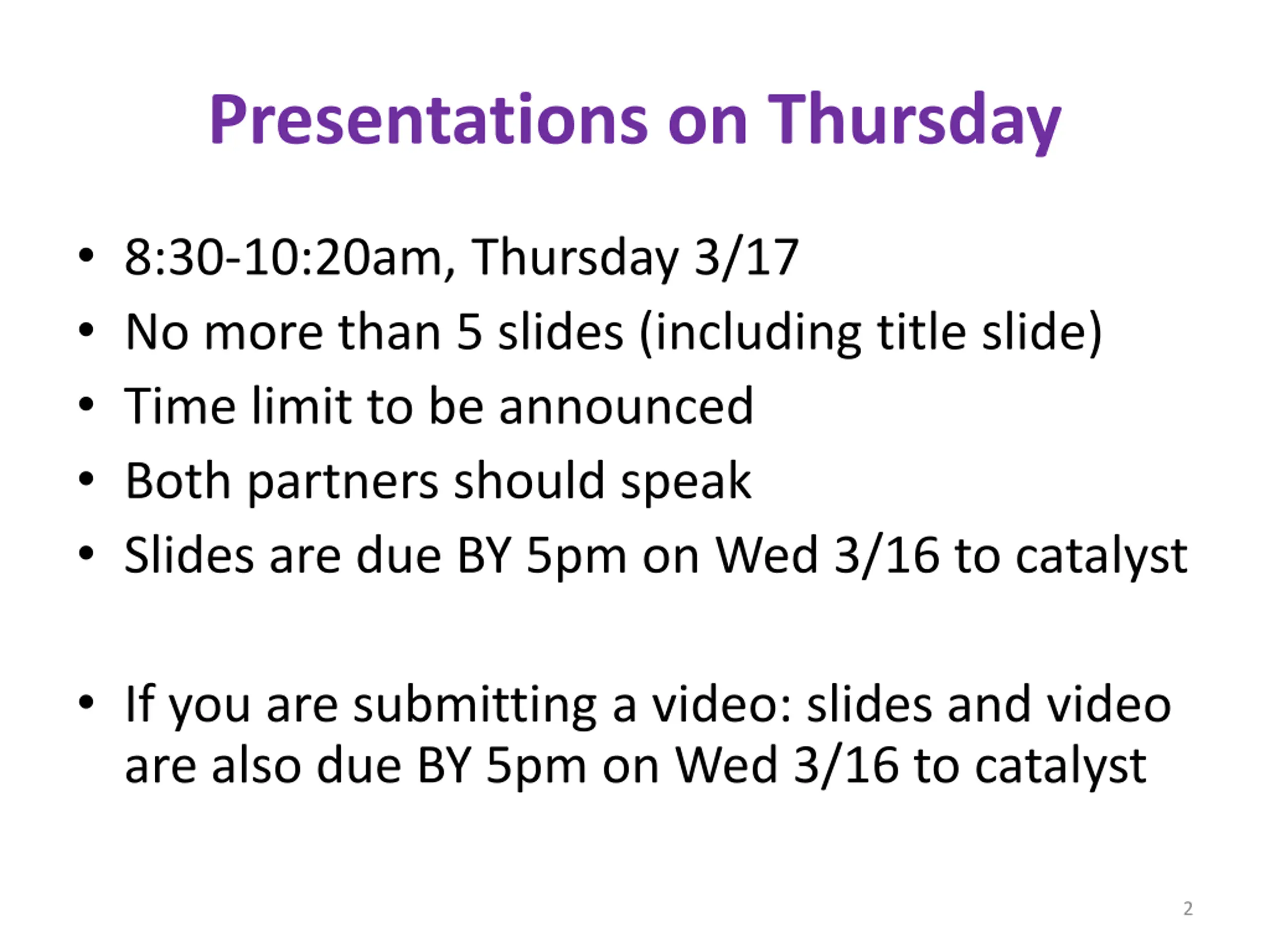 Presentations on Thursday 8:30-10:20am, Thursday 3/17 No more than 5 slides (including title slide) Time limit to be announced Both partners should speak Slides are due BY 5pm on Wed 3/16 to catalyst If you are submitting a video: slides and video are also due BY 5pm on Wed 3/16 to catalyst 2