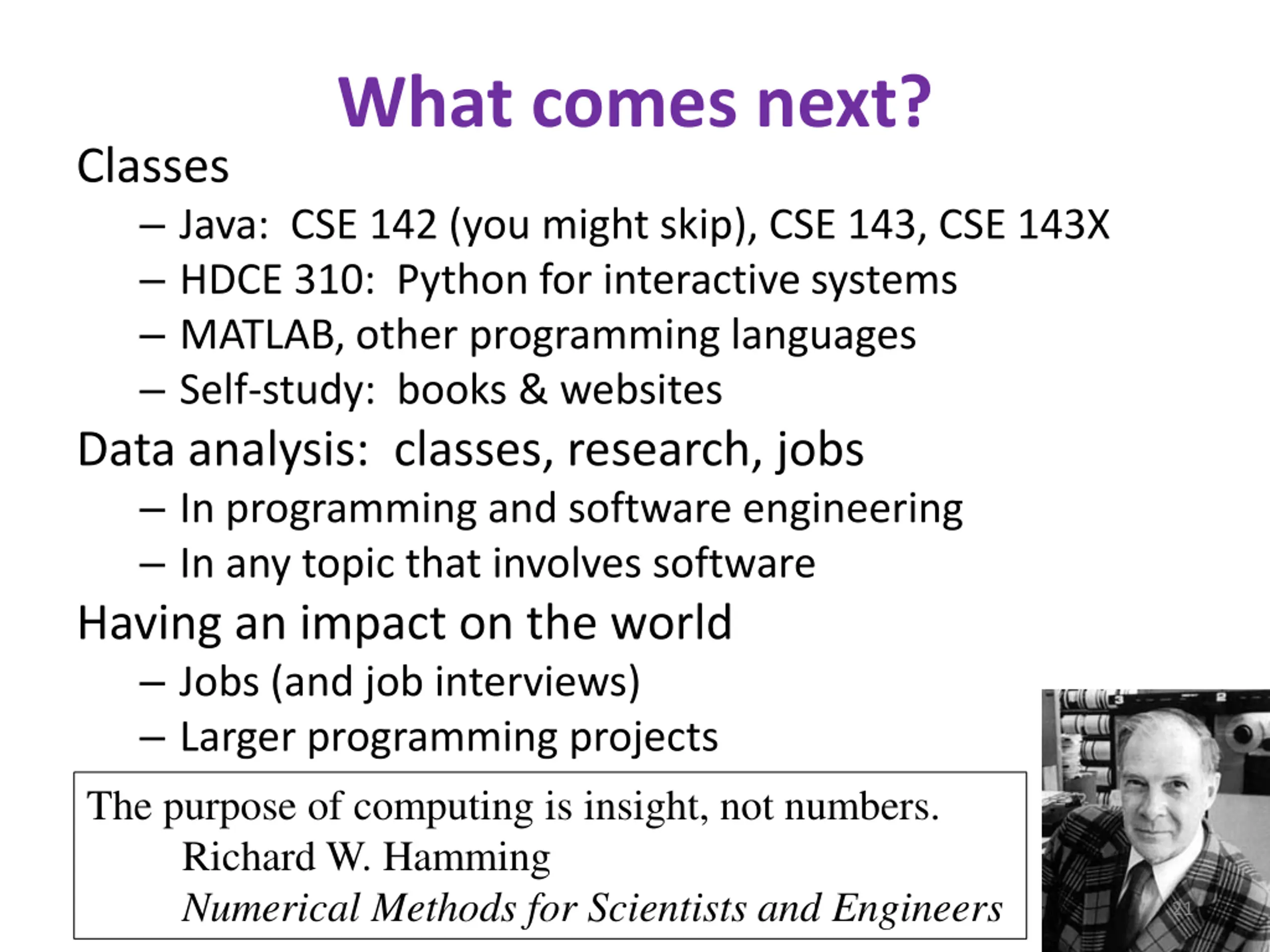 What comes next? Classes Java: CSE 142 (you might skip), CSE 143, CSE 143X HDCE 310: Python for interactive systems MATLAB, other programming languages Self-study: books & websites Data analysis: classes, research, jobs In programming and software engineering In any topic that involves software Having an impact on the world Jobs (and job interviews) Larger programming projects The purpose of computing is insight, not numbers. Richard W. Hamming Numerical Methods for Scientists and Engineers 21