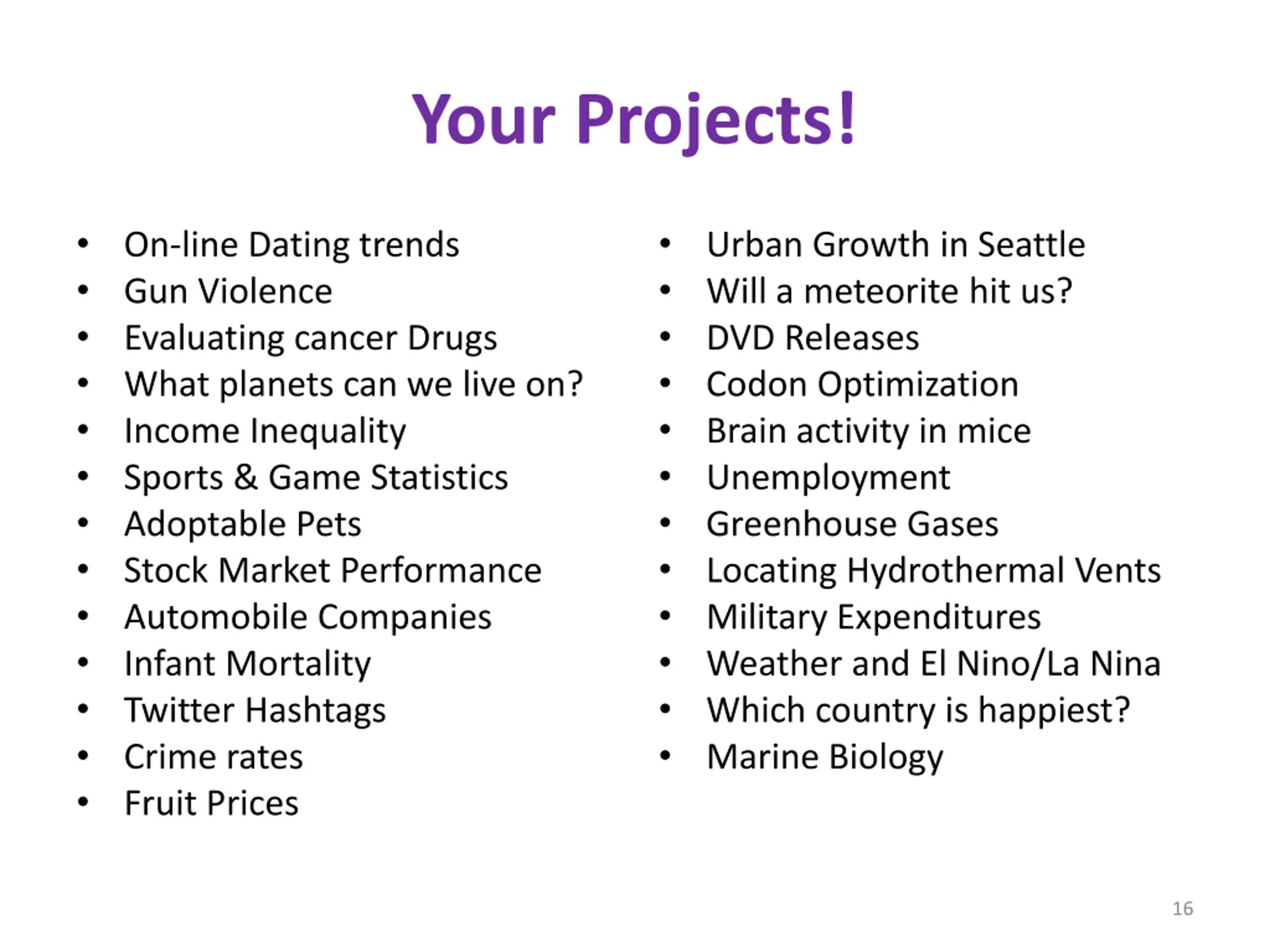 Your Projects! On-line Dating trends Gun Violence Evaluating cancer Drugs What planets can we live on? Income Inequality Sports & Game Statistics Adoptable Pets Stock Market Performance Automobile Companies Infant Mortality Twitter Hashtags Crime rates Fruit Prices Urban Growth in Seattle Will a meteorite hit us? DVD Releases Codon Optimization Brain activity in mice Unemployment Greenhouse Gases Locating Hydrothermal Vents Military Expenditures Weather and El Nino/La Nina Which country is happiest? Marine Biology 16