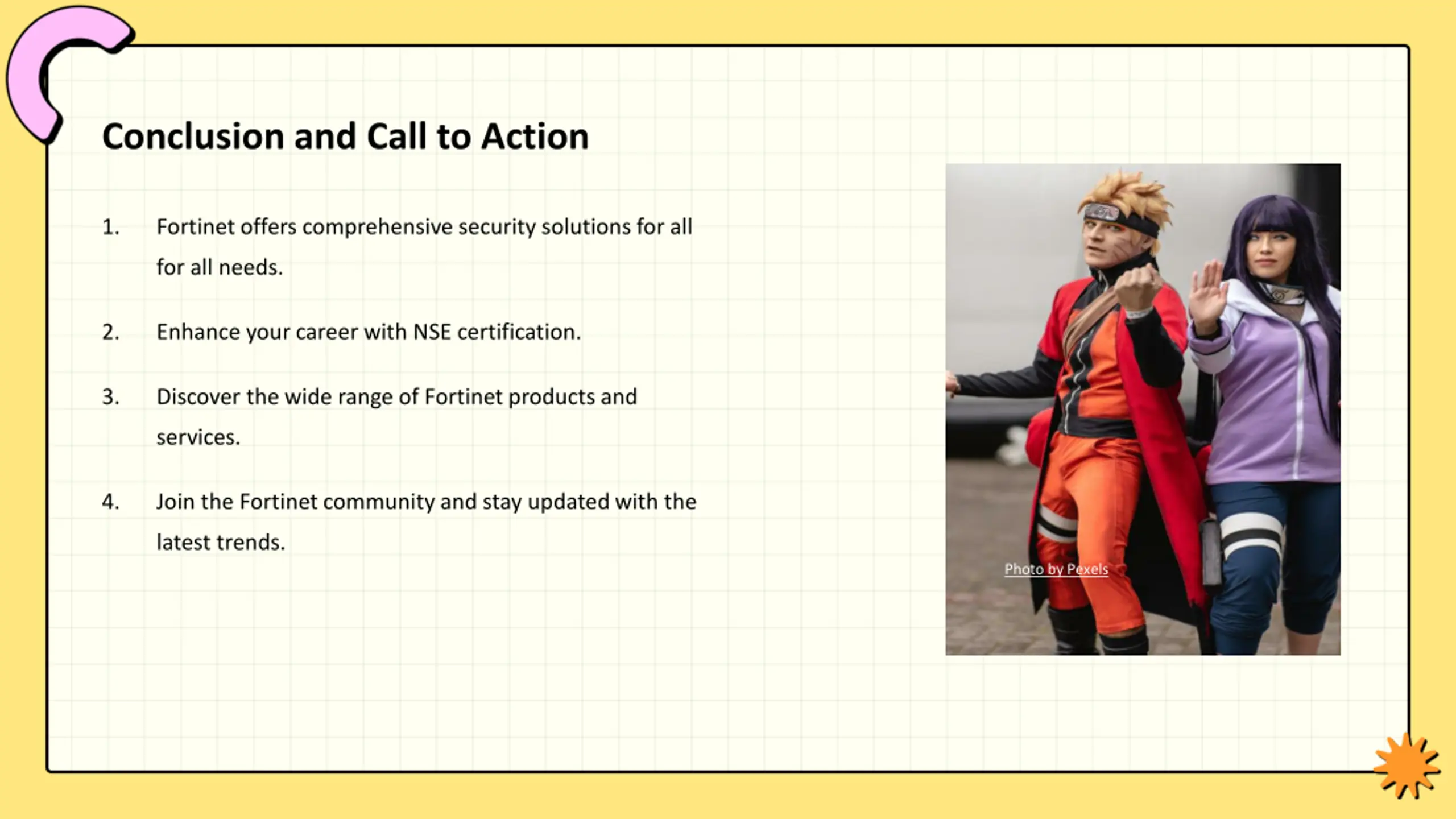 Conclusion and Call to Action 1. Fortinet offers comprehensive security solutions for all for all needs. 2. Enhance your career with NSE certification. 3. Discover the wide range of Fortinet products and services. 4. Join the Fortinet community and stay updated with the latest trends. Photo by Pexels