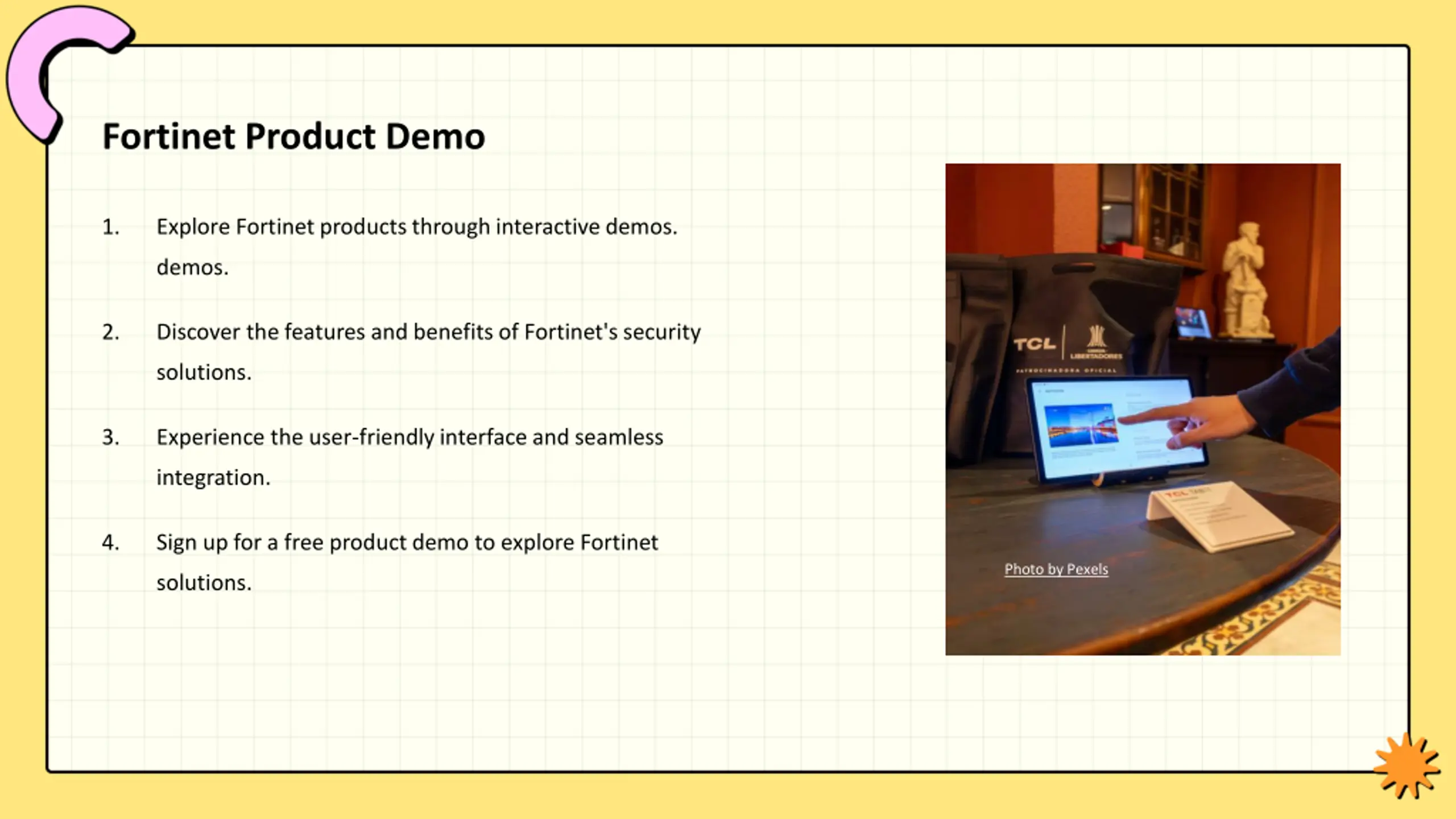Fortinet Product Demo 1. Explore Fortinet products through interactive demos. demos. 2. Discover the features and benefits of Fortinet's security solutions. 3. Experience the user-friendly interface and seamless integration. 4. Sign up for a free product demo to explore Fortinet Photo by Pexels solutions.