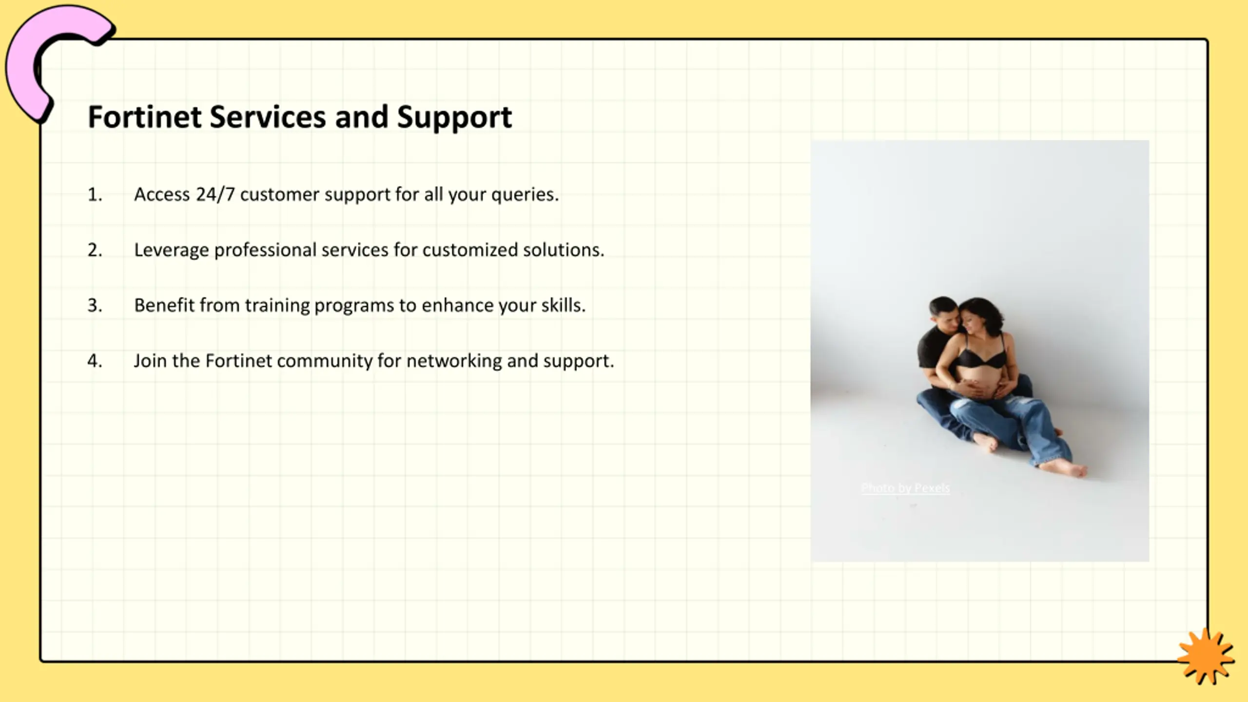 Fortinet Services and Support 1. Access 24/7 customer support for all your queries. 2. Leverage professional services for customized solutions. 3. Benefit from training programs to enhance your skills. 4. Join the Fortinet community for networking and support. Photo by Pexels