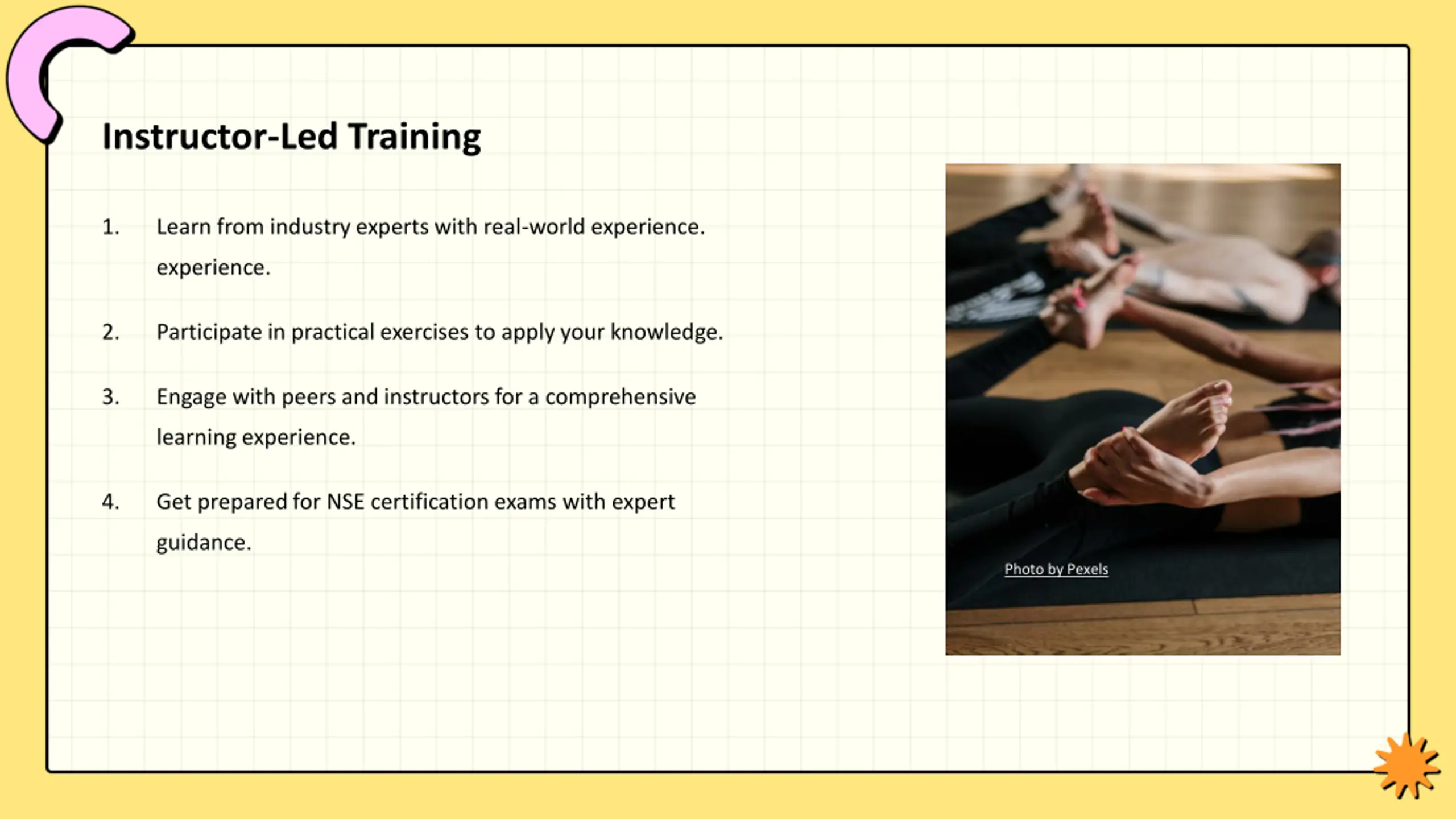Instructor-Led Training 1. Learn from industry experts with real-world experience. experience. 2. Participate in practical exercises to apply your knowledge. 3. Engage with peers and instructors for a comprehensive learning experience. 4. Get prepared for NSE certification exams with expert guidance. Photo by Pexels