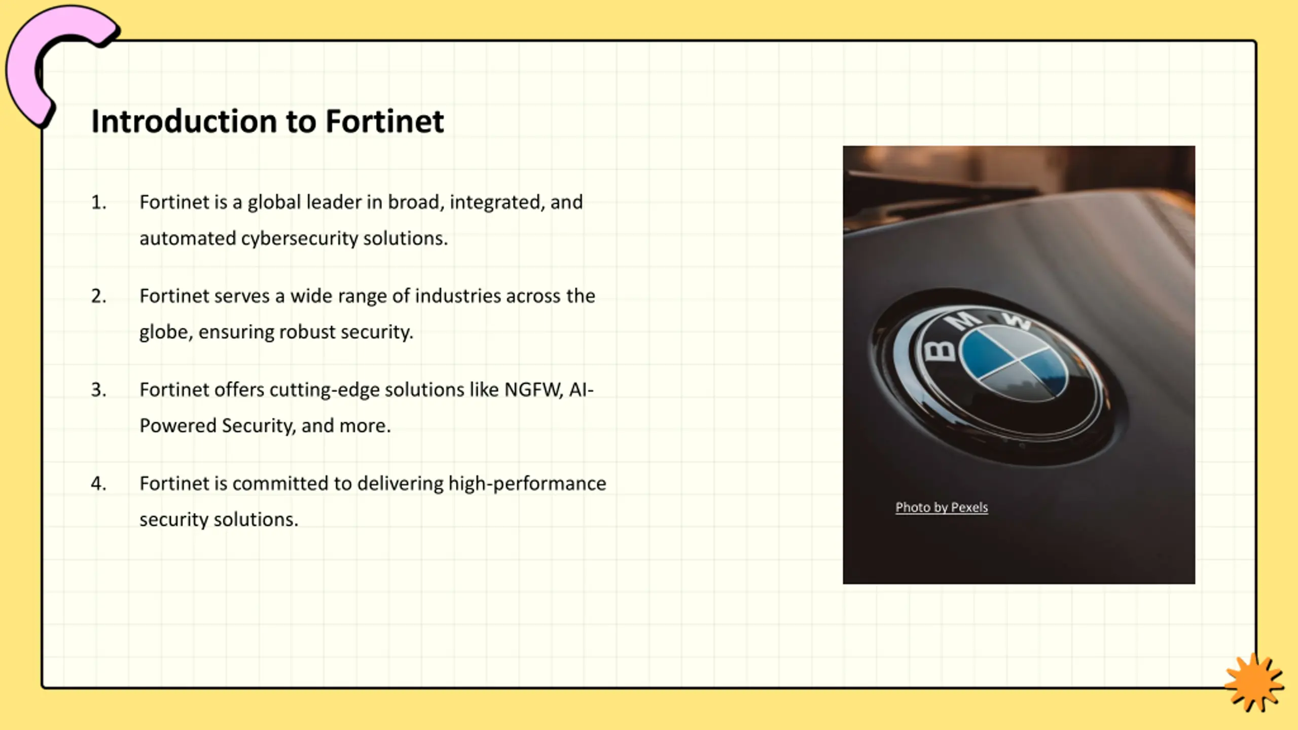Introduction to Fortinet 1. Fortinet is a global leader in broad, integrated, and automated cybersecurity solutions. 2. Fortinet serves a wide range of industries across the globe, ensuring robust security. 3. Fortinet offers cutting-edge solutions like NGFW, AI- Powered Security, and more. 4. Fortinet is committed to delivering high-performance Photo by Pexels security solutions.