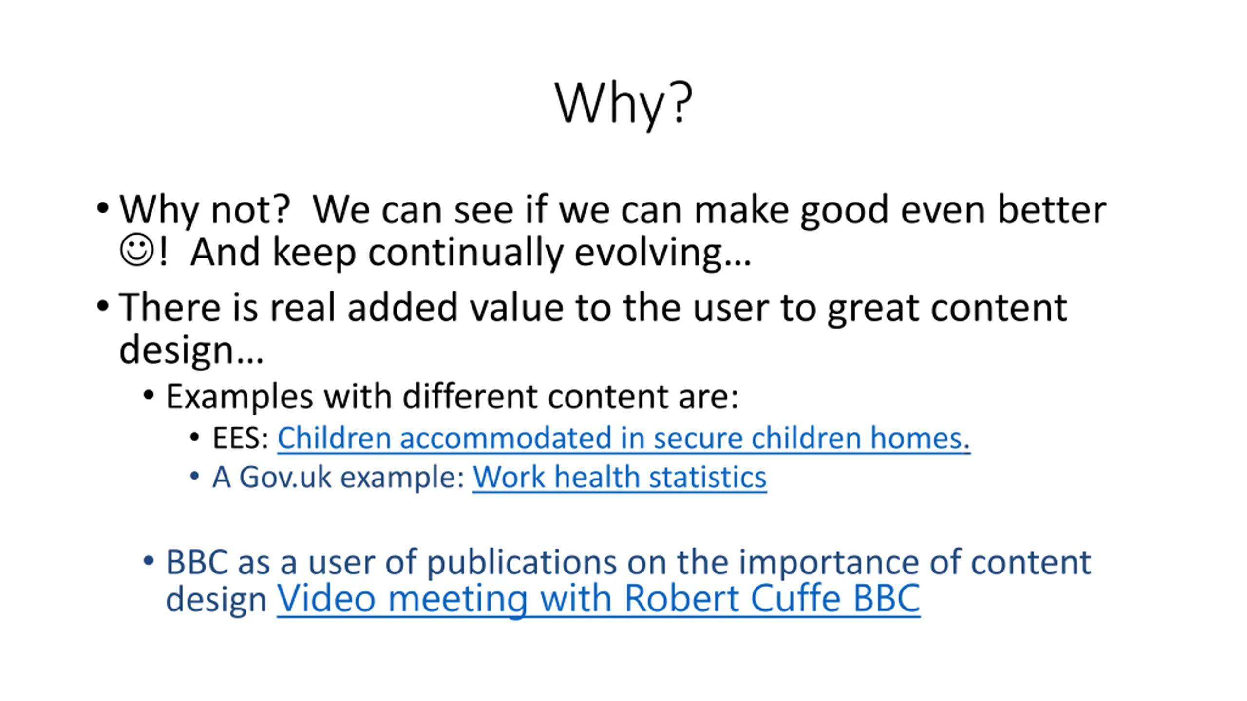 Why? Why not? We can see if we can make good even better ! And keep continually evolving There is real added value to the user to great content design Examples with different content are: EES: Children accommodated in secure children homes. A Gov.uk example: Work health statistics BBC as a user of publications on the importance of content design Video meeting with Robert Cuffe BBC