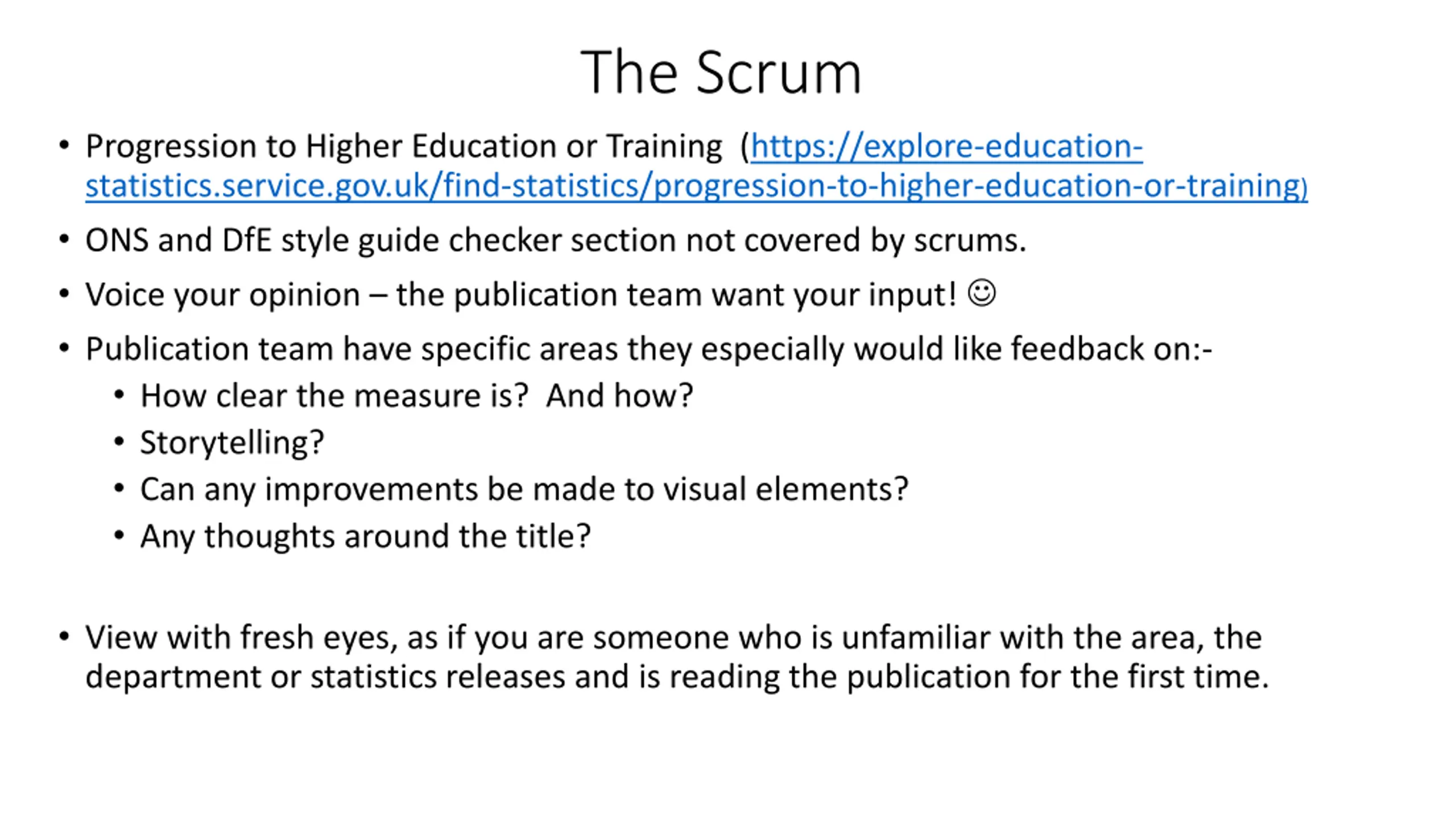 The Scrum Progression to Higher Education or Training (https://explore-education- statistics.service.gov.uk/find-statistics/progression-to-higher-education-or-training) ONS and DfE style guide checker section not covered by scrums. Voice your opinion the publication team want your input! Publication team have specific areas they especially would like feedback on:- How clear the measure is? And how? Storytelling? Can any improvements be made to visual elements? Any thoughts around the title? View with fresh eyes, as if you are someone who is unfamiliar with the area, the department or statistics releases and is reading the publication for the first time.