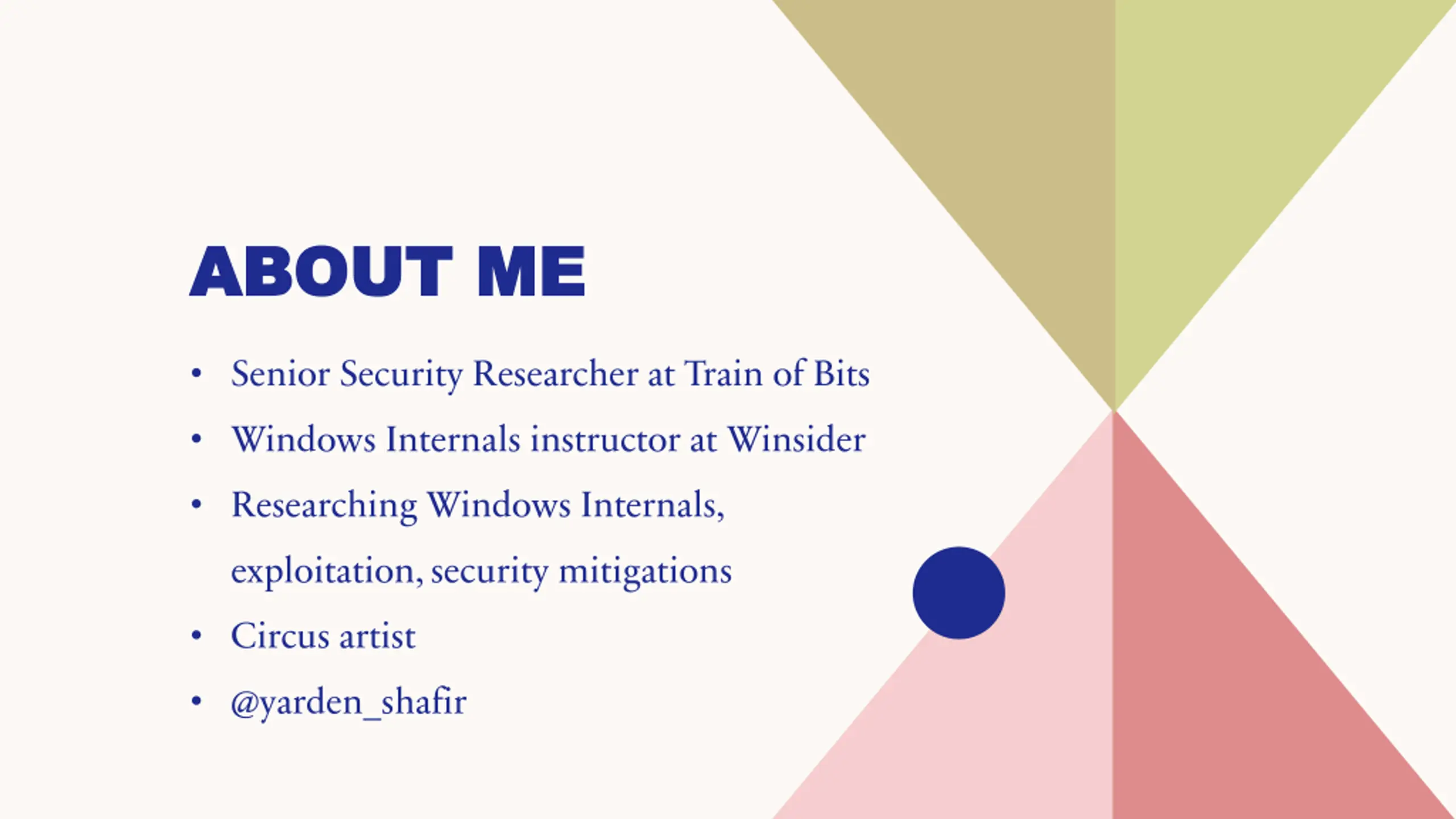 ABOUT ME ABOUT ME Senior Security Researcher at Train of Bits Windows Internals instructor at Winsider Researching Windows Internals, exploitation, security mitigations Circus artist @yarden_shafir