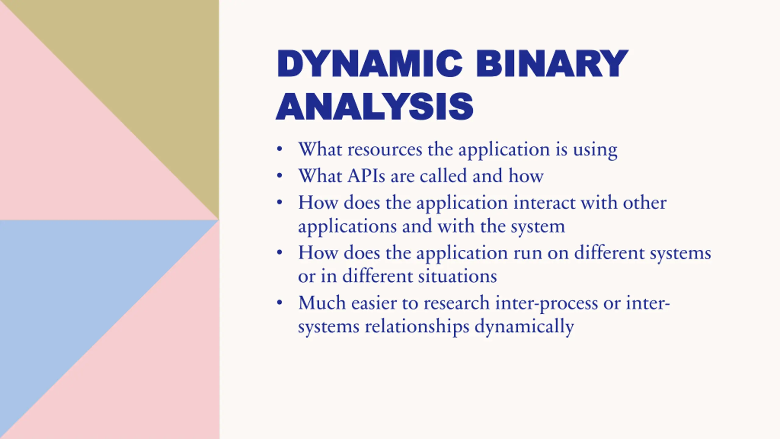 DYNAMIC BINARY DYNAMIC BINARY ANALYSIS ANALYSIS What resources the application is using What APIs are called and how How does the application interact with other applications and with the system How does the application run on different systems or in different situations Much easier to research inter-process or inter- systems relationships dynamically