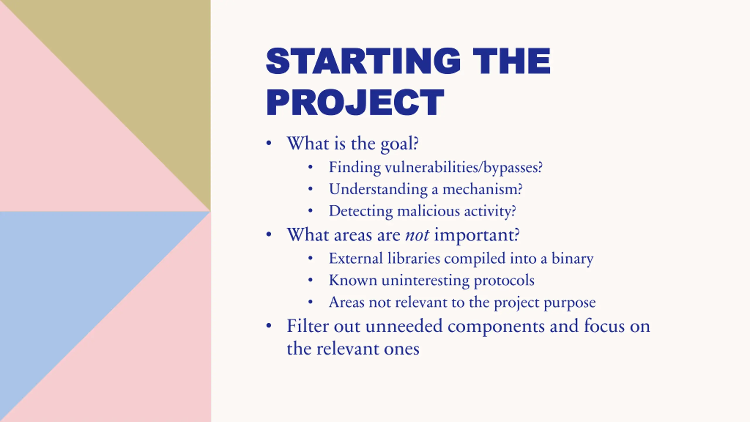 STARTING THE STARTING THE PROJECT PROJECT What is the goal? Finding vulnerabilities/bypasses? Understanding a mechanism? Detecting malicious activity? What areas are not important? External libraries compiled into a binary Known uninteresting protocols Areas not relevant to the project purpose Filter out unneeded components and focus on the relevant ones