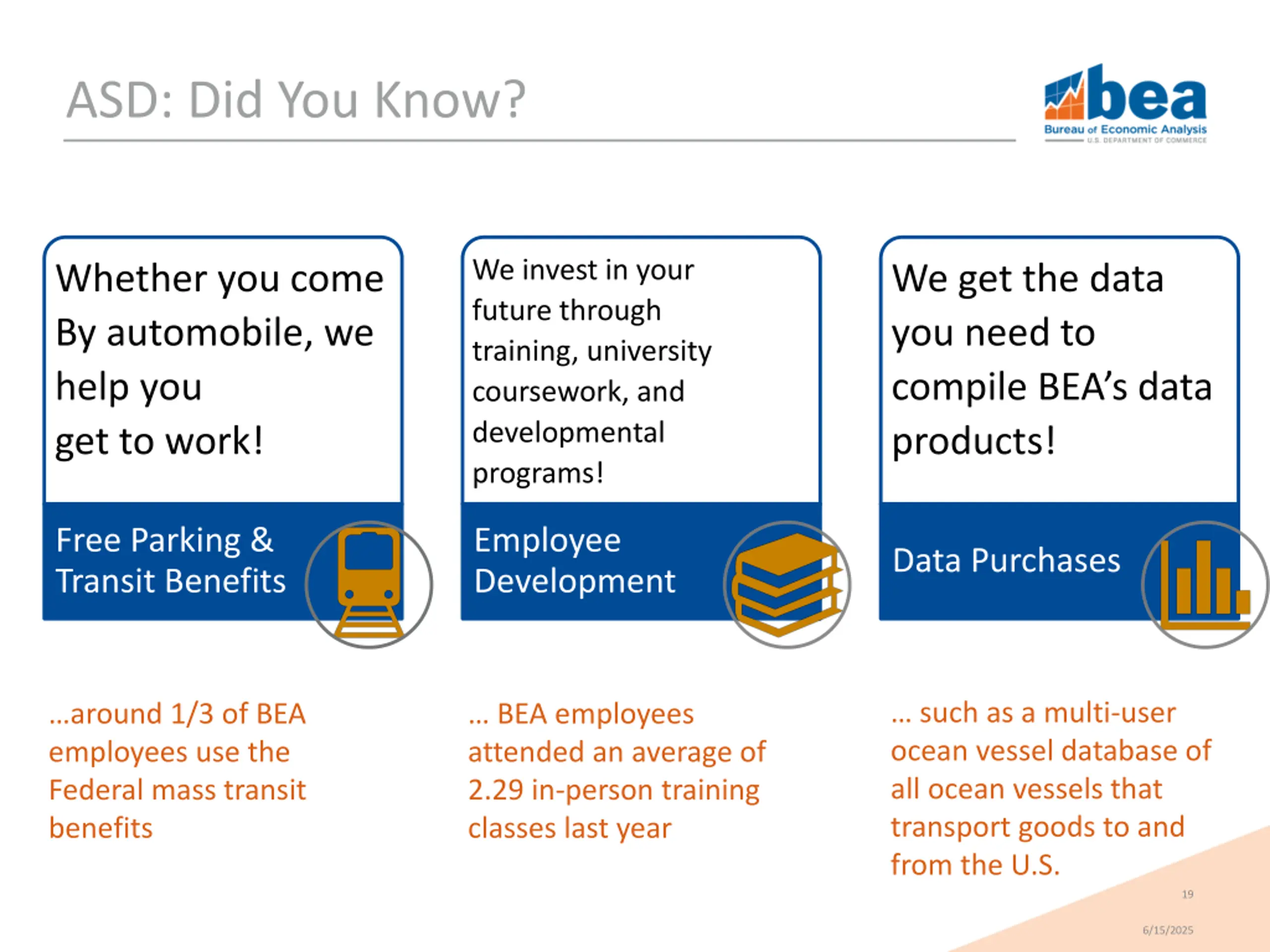 ASD: Did You Know? We invest in your future through training, university coursework, and developmental programs! Whether you come By automobile, we help you get to work! We get the data you need to compile BEA s data products! Free Parking & Transit Benefits Employee Development Data Purchases such as a multi-user ocean vessel database of all ocean vessels that transport goods to and from the U.S. around 1/3 of BEA employees use the Federal mass transit benefits BEA employees attended an average of 2.29 in-person training classes last year 19 6/15/2025