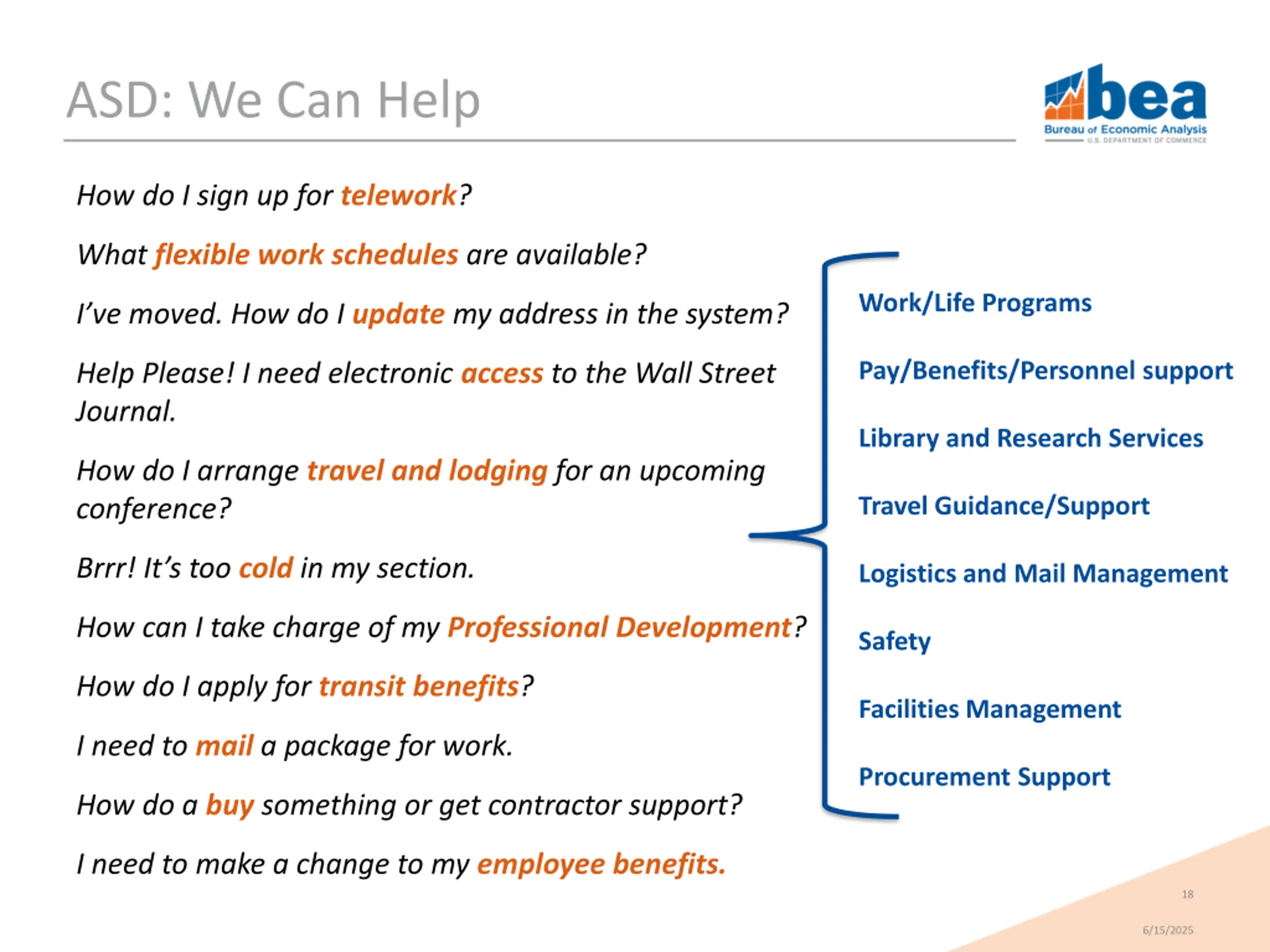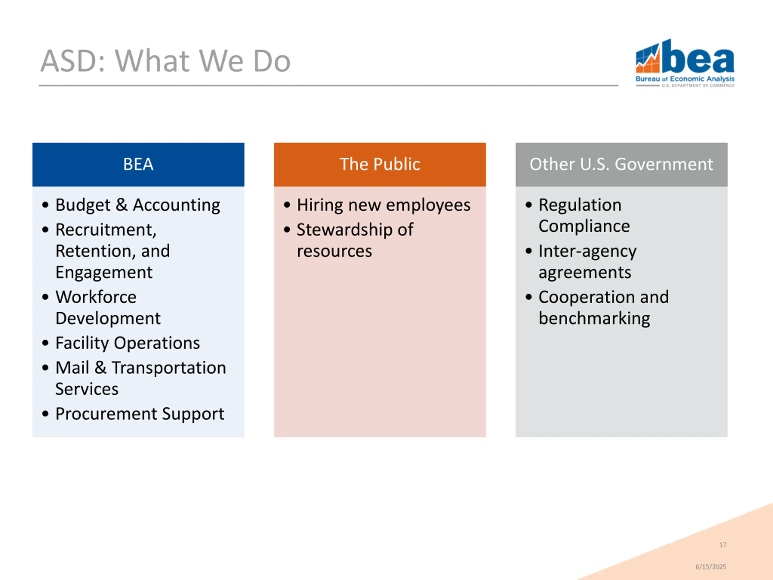 ASD: What We Do BEA The Public Other U.S. Government Budget & Accounting Recruitment, Retention, and Engagement Workforce Development Facility Operations Mail & Transportation Services Procurement Support Hiring new employees Stewardship of resources Regulation Compliance Inter-agency agreements Cooperation and benchmarking 17 6/15/2025
