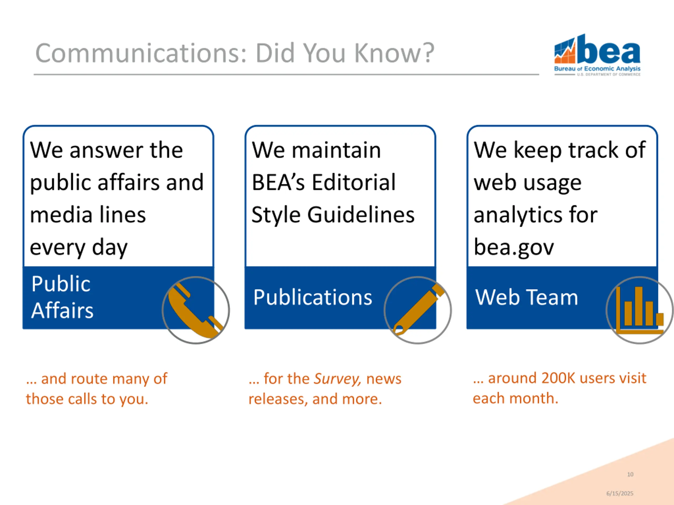 Communications: Did You Know? We answer the public affairs and media lines every day Public Affairs We maintain BEA s Editorial Style Guidelines We keep track of web usage analytics for bea.gov Publications Web Team around 200K users visit each month. and route many of those calls to you. for the Survey, news releases, and more. 10 6/15/2025