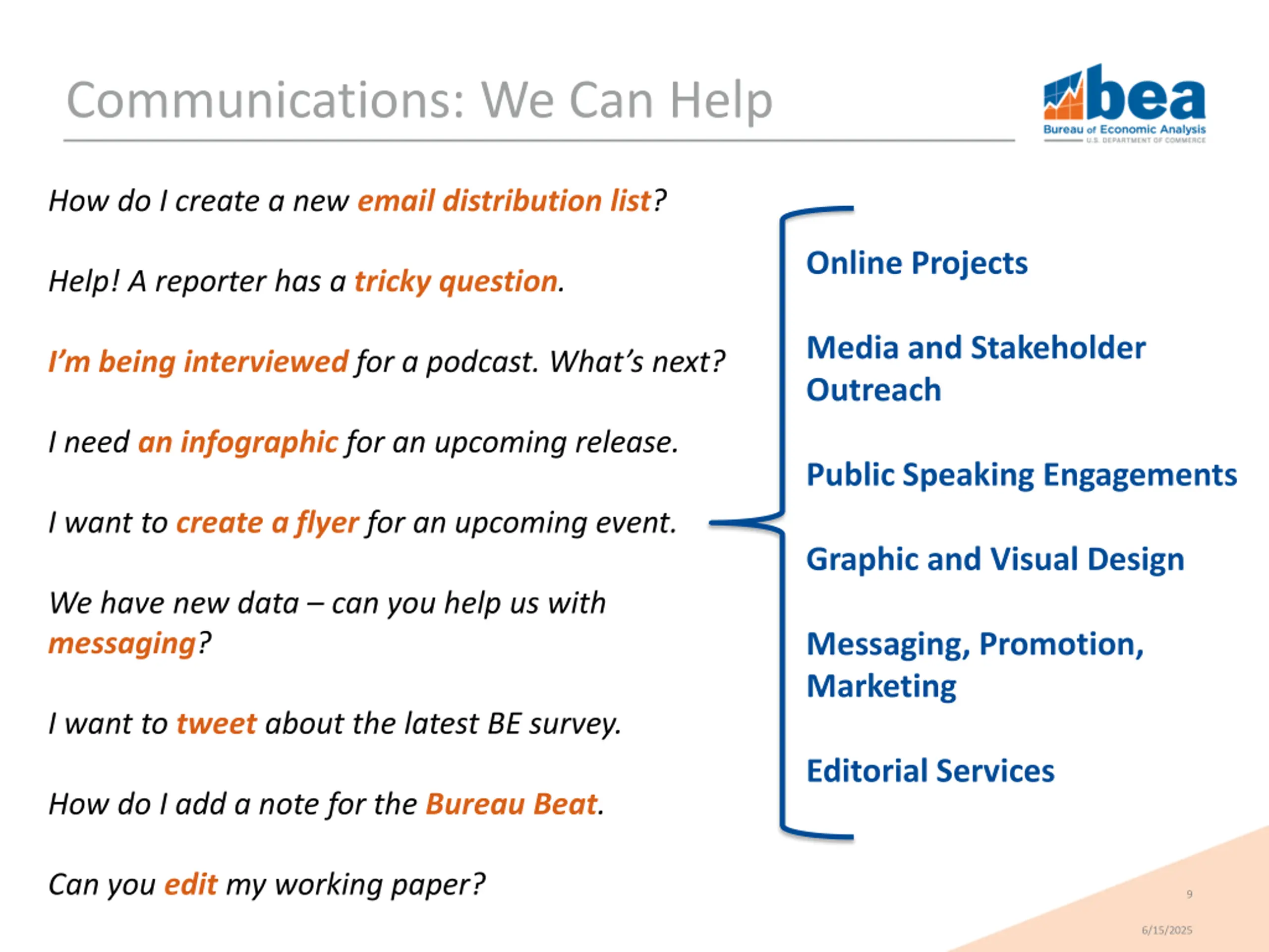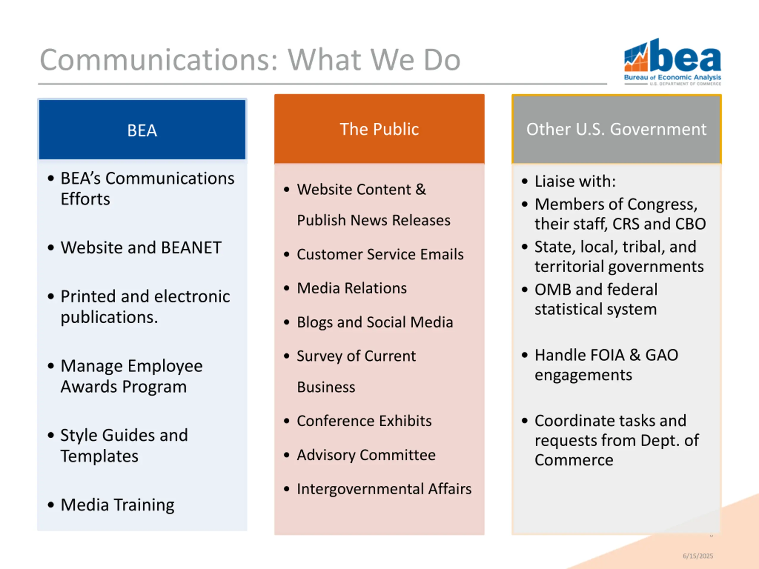 Communications: What We Do The Public Other U.S. Government BEA BEA s Communications Efforts Liaise with: Members of Congress, their staff, CRS and CBO State, local, tribal, and territorial governments OMB and federal statistical system Website Content & Publish News Releases Website and BEANET Customer Service Emails Media Relations Printed and electronic publications. Blogs and Social Media Handle FOIA & GAO engagements Survey of Current Manage Employee Awards Program Business Coordinate tasks and requests from Dept. of Commerce Conference Exhibits Style Guides and Templates Advisory Committee Intergovernmental Affairs Media Training 8 6/15/2025