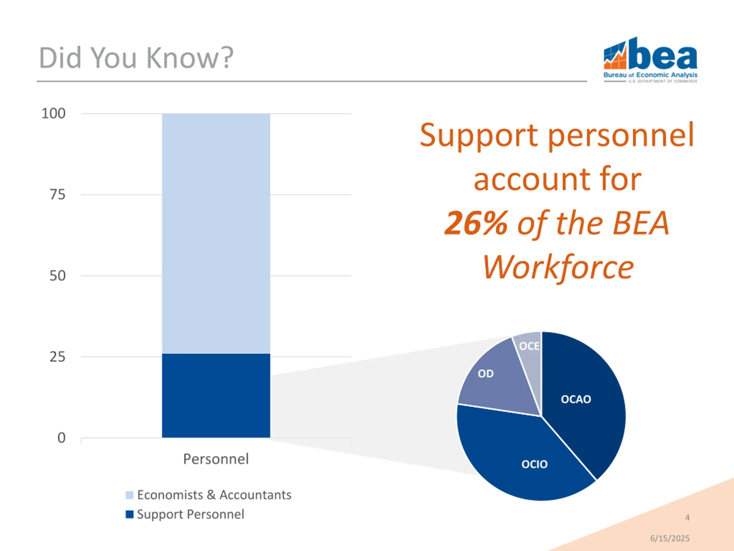 Did You Know? 100 Support personnel account for 26% of the BEA Workforce 75 50 OCE 25 OD OCAO 0 Personnel OCIO Economists & Accountants Support Personnel 4 6/15/2025