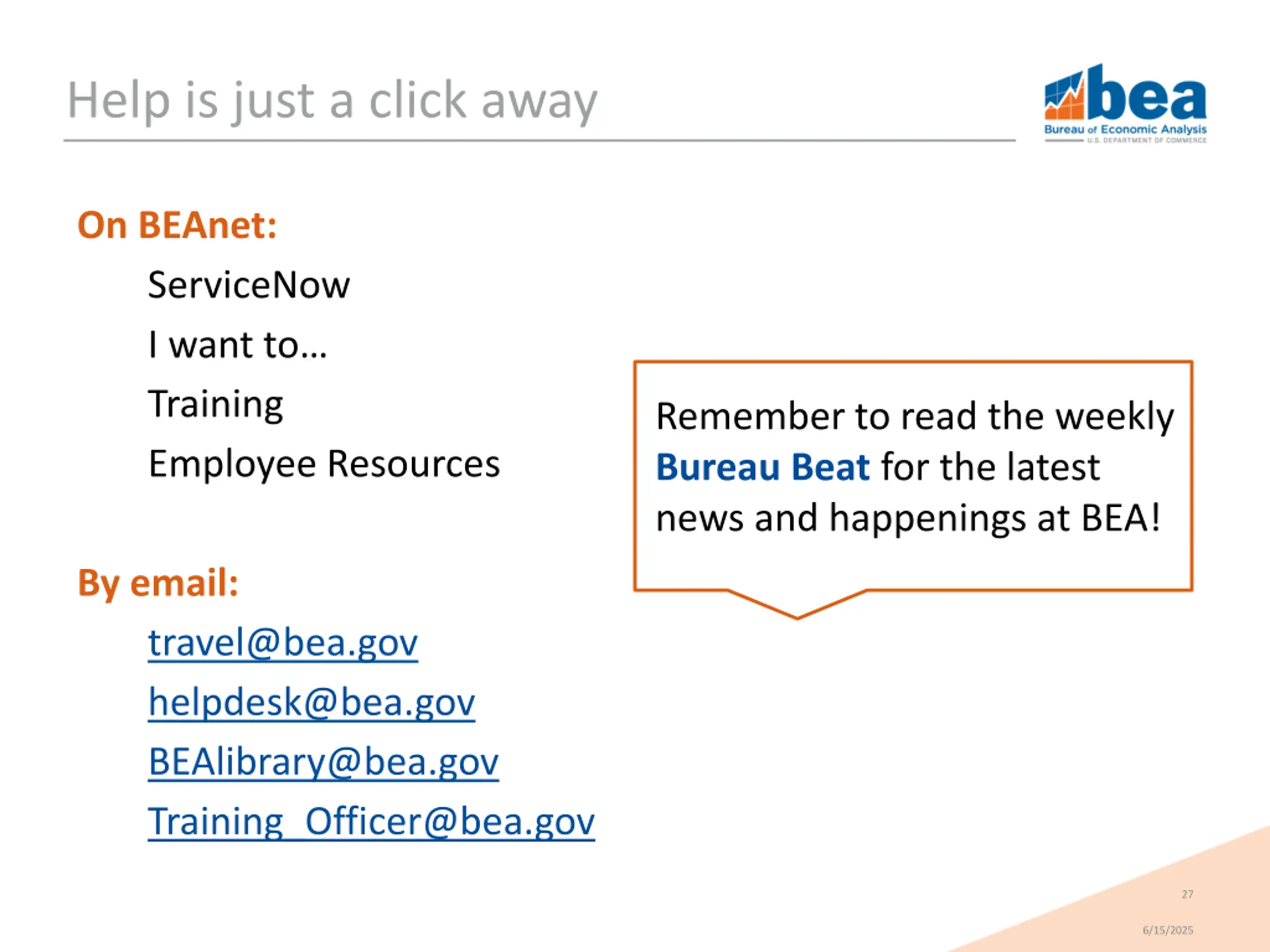 Help is just a click away On BEAnet: ServiceNow I want to Training Employee Resources Remember to read the weekly Bureau Beat for the latest news and happenings at BEA! By email: travel@bea.gov helpdesk@bea.gov BEAlibrary@bea.gov Training_Officer@bea.gov 27 6/15/2025