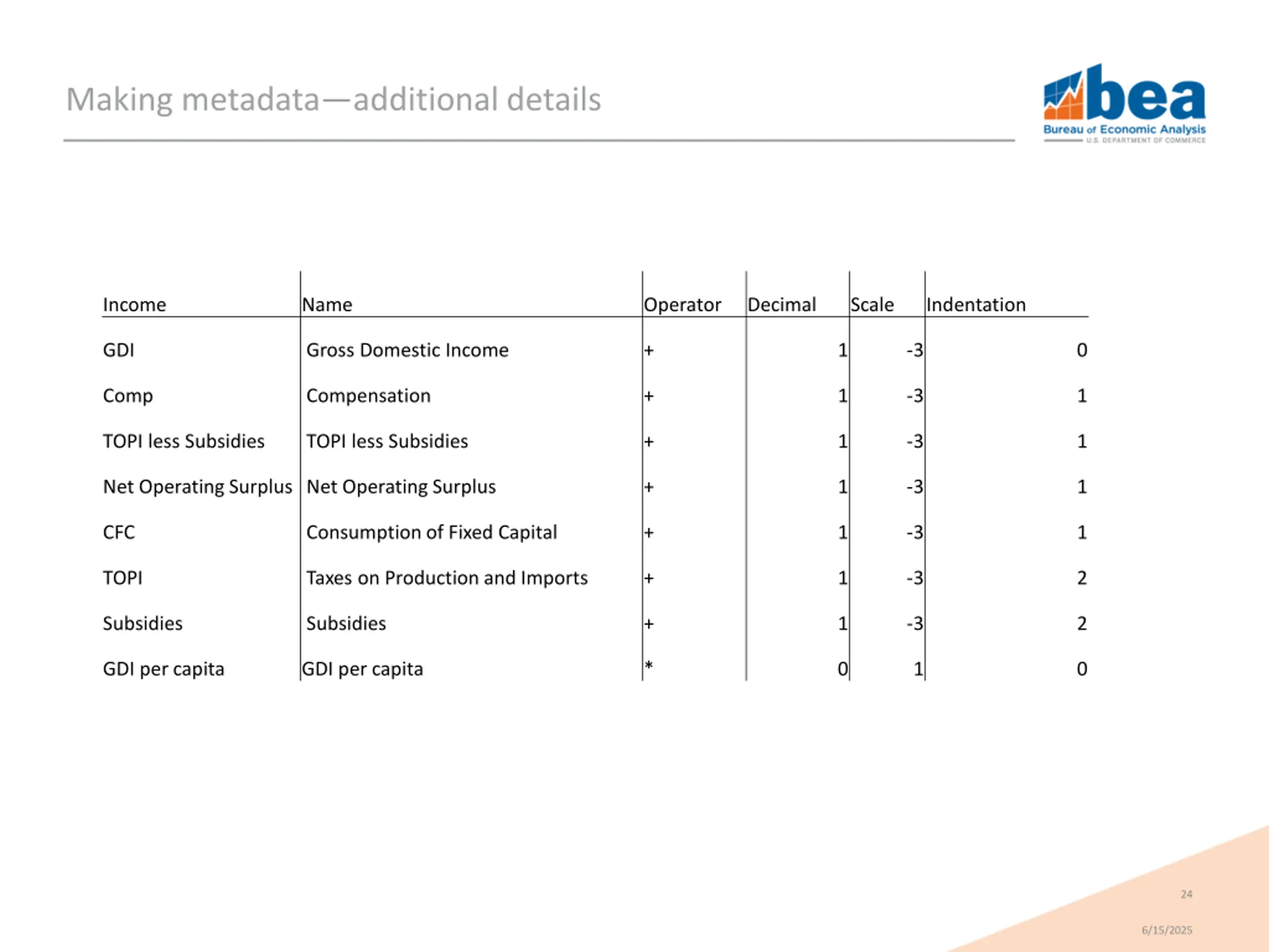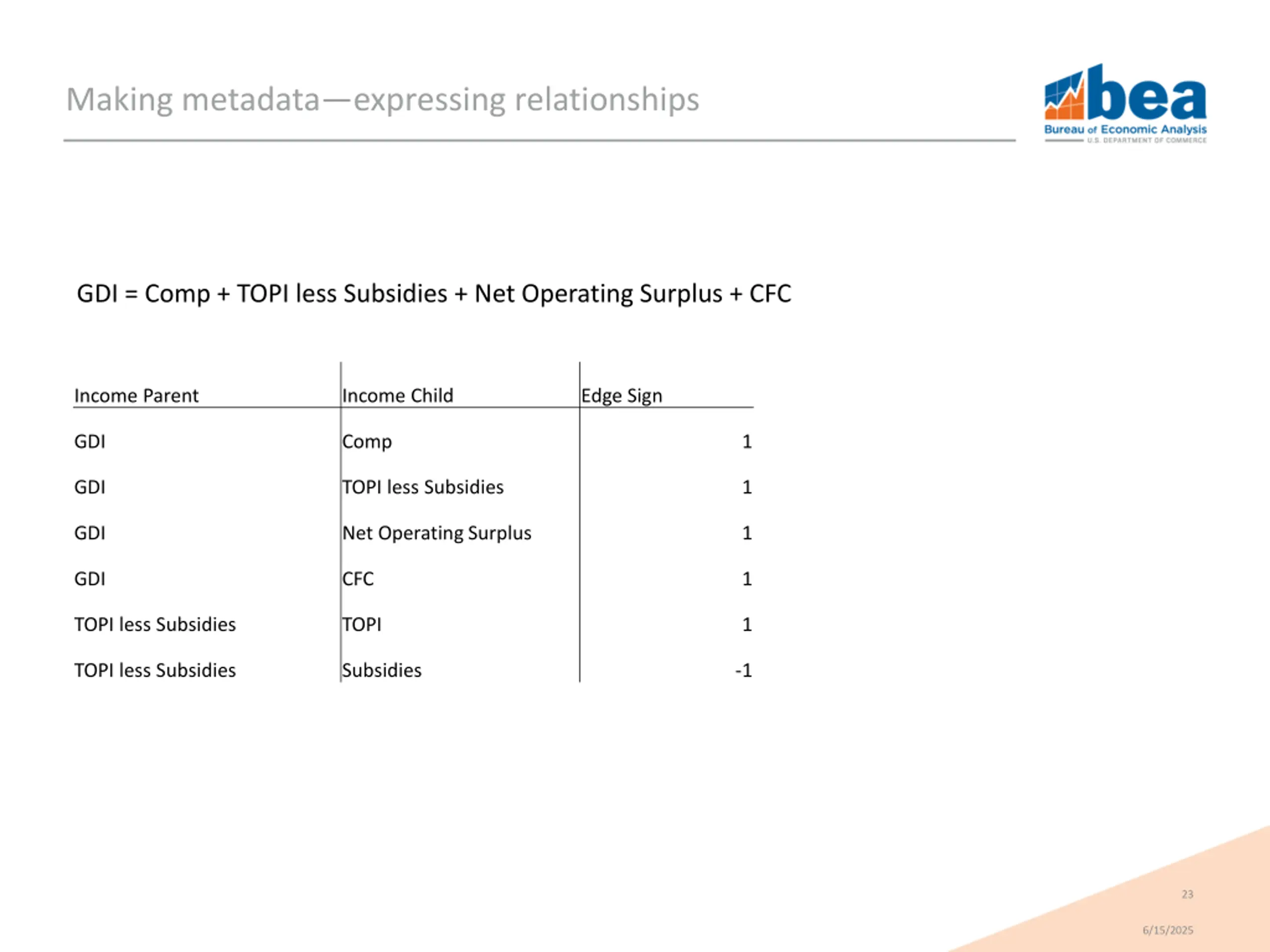Making metadataexpressing relationships GDI = Comp + TOPI less Subsidies + Net Operating Surplus + CFC Income Parent Income Child Edge Sign GDI Comp 1 GDI TOPI less Subsidies 1 GDI Net Operating Surplus 1 GDI CFC 1 TOPI less Subsidies TOPI 1 TOPI less Subsidies Subsidies -1 23 6/15/2025