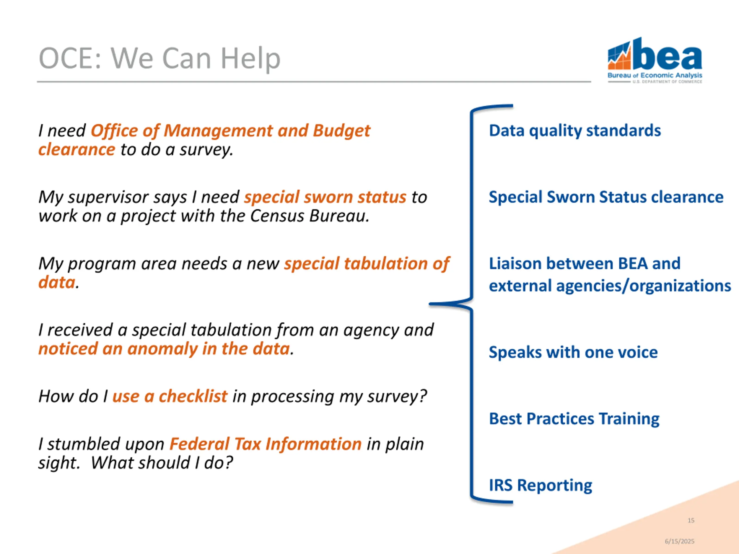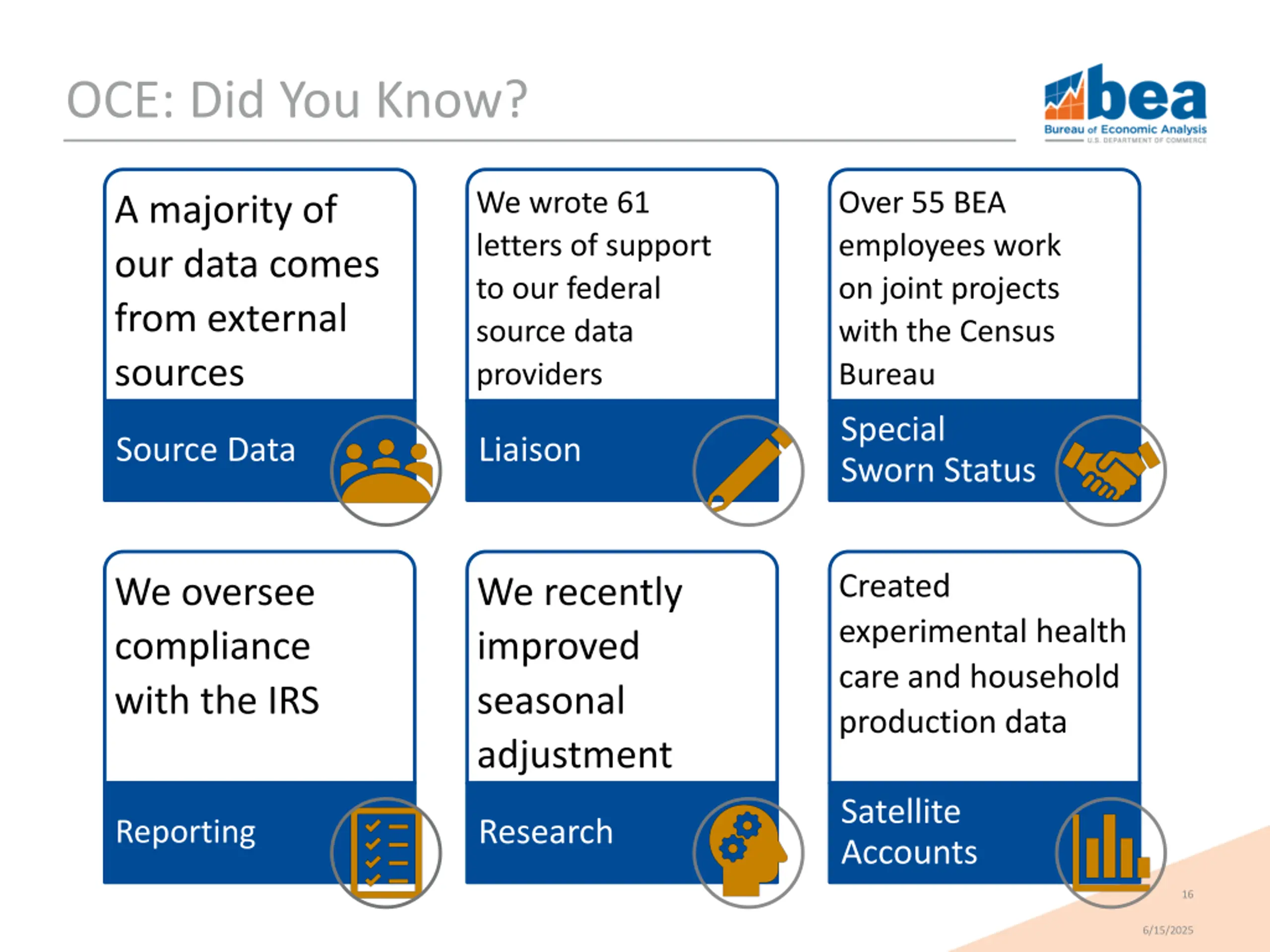 OCE: What We Do BEA The Public Other U.S. Government BEA s representative with external source data agencies Directs and coordinates the flow of external source data within BEA Outreach efforts to the academic community Coordinates bureau-wide responses to requests from OMB, DOC and federal agencies Enforces best practices for producing BEA s estimates and safeguarding of title data through annual trainings, policies and procedures Organizes sessions to showcase recent BEA research Ensures the quality of BEA s data complies with the information quality guidelines set forth by OMB Publishes articles in the Survey of Current Business, including the Health Expenditure and Household Production satellite accounts Conducts research into methodology to improve estimates, such as better seasonal adjustment methods Reviews federal register notices on a daily basis 14 6/15/2025