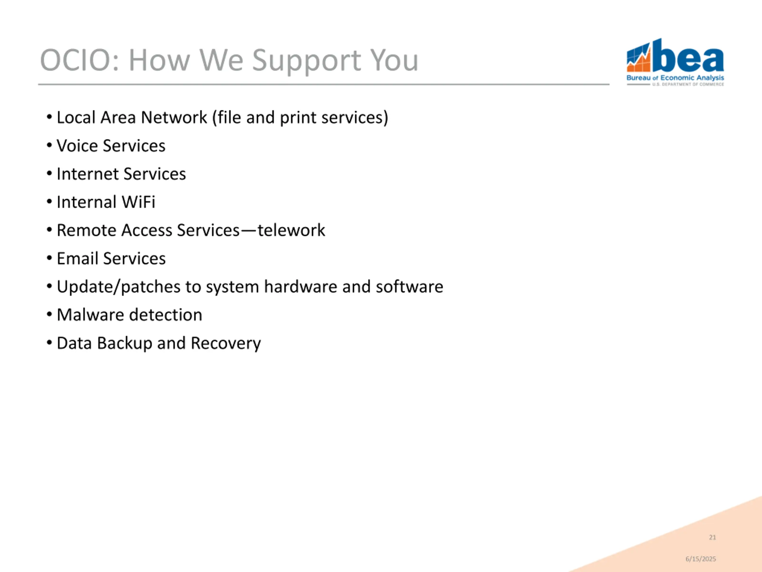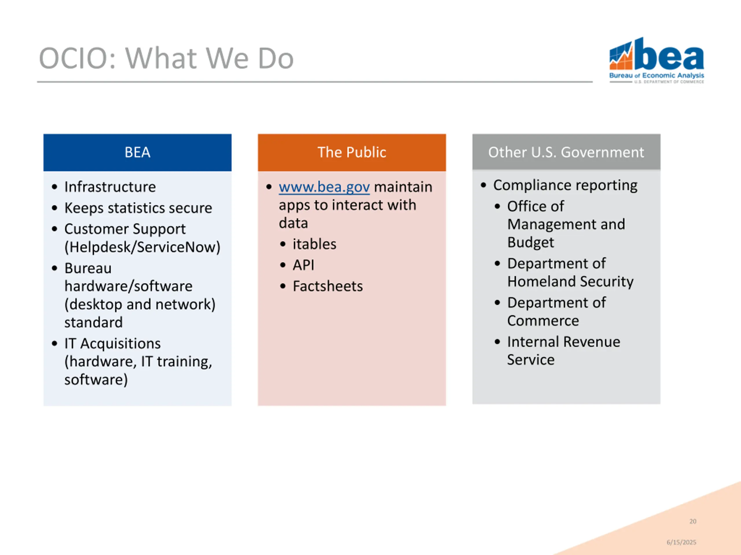 OCIO: What We Do BEA The Public Other U.S. Government Compliance reporting Office of Management and Budget Department of Homeland Security Department of Commerce Internal Revenue Service www.bea.gov Infrastructure Keeps statistics secure Customer Support (Helpdesk/ServiceNow) Bureau hardware/software (desktop and network) standard IT Acquisitions (hardware, IT training, software) www.bea.gov maintain apps to interact with data itables API Factsheets 20 6/15/2025