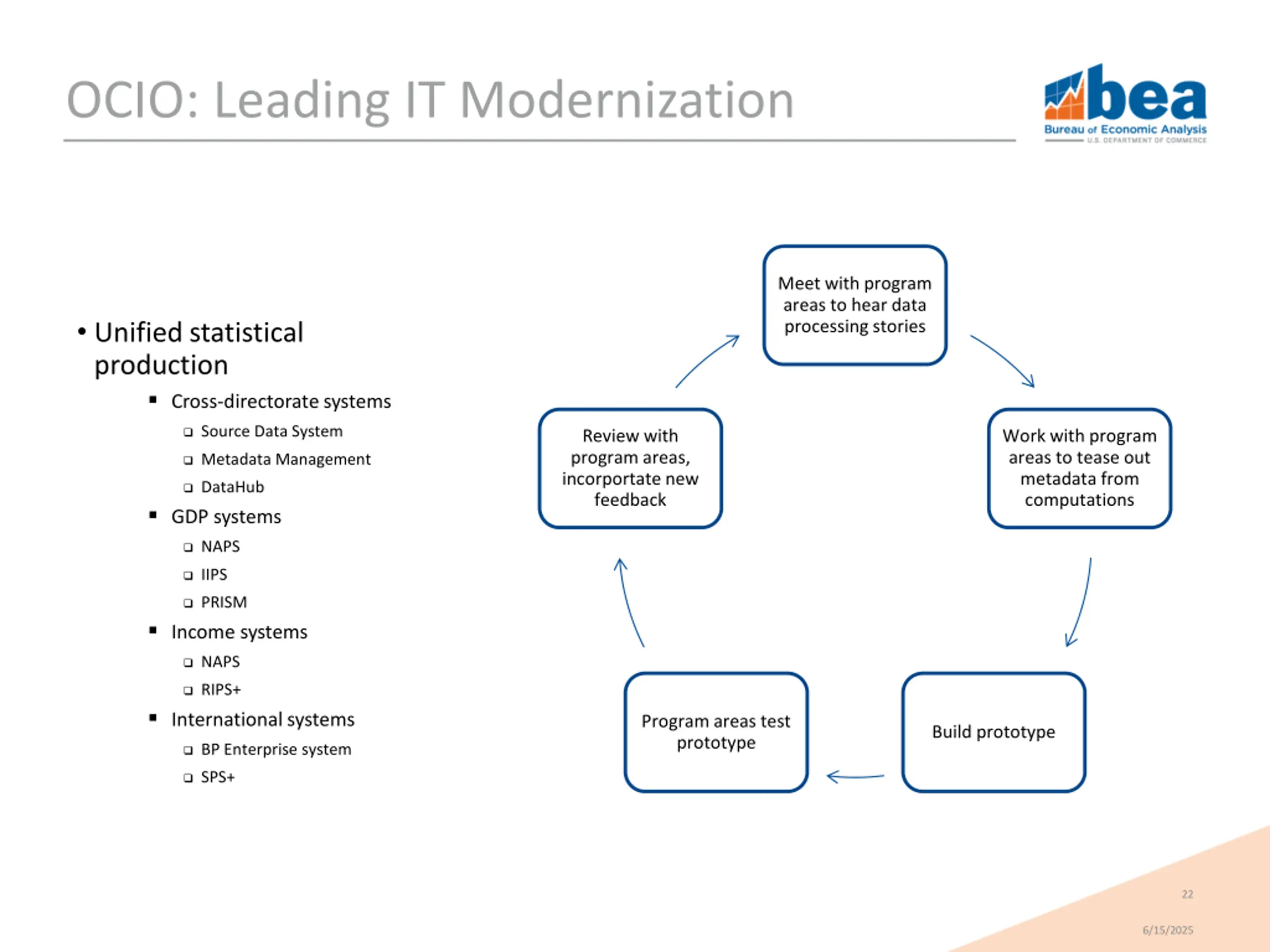 OCIO: Leading IT Modernization Meet with program areas to hear data processing stories Unified statistical production Cross-directorate systems Source Data System Review with program areas, incorportate new feedback Work with program areas to tease out metadata from computations Metadata Management DataHub GDP systems NAPS IIPS PRISM Income systems NAPS RIPS+ International systems Program areas test prototype Build prototype BP Enterprise system SPS+ 22 6/15/2025