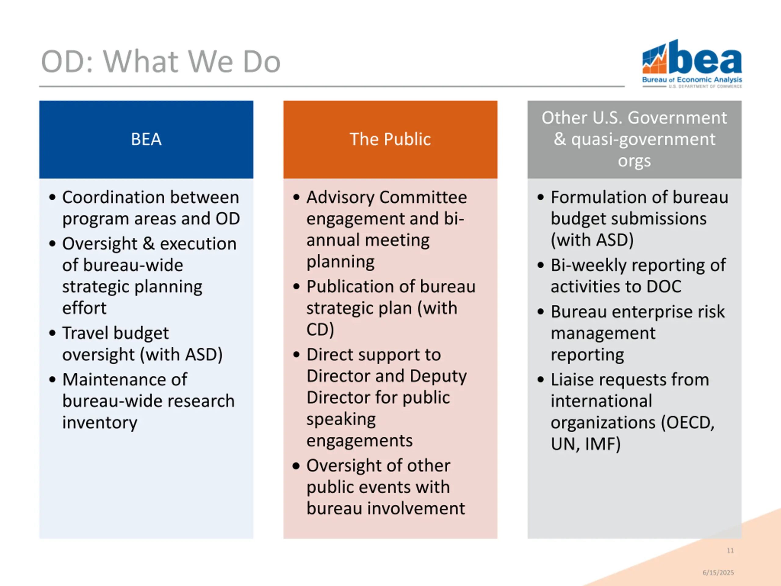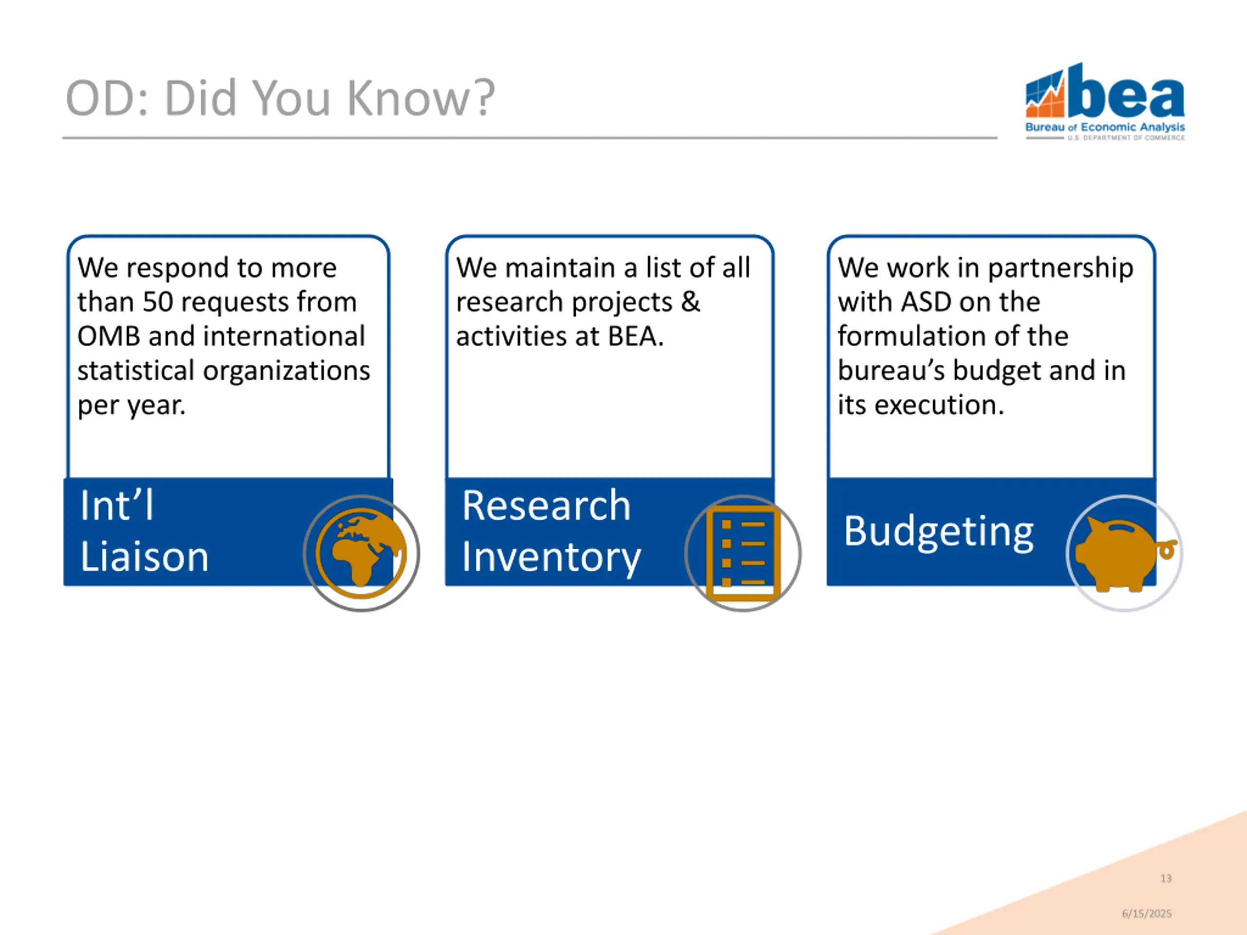OD: Did You Know? We respond to more than 50 requests from OMB and international statistical organizations per year. We maintain a list of all research projects & activities at BEA. We work in partnership with ASD on the formulation of the bureau s budget and in its execution. Int l Liaison Research Inventory Budgeting 13 6/15/2025