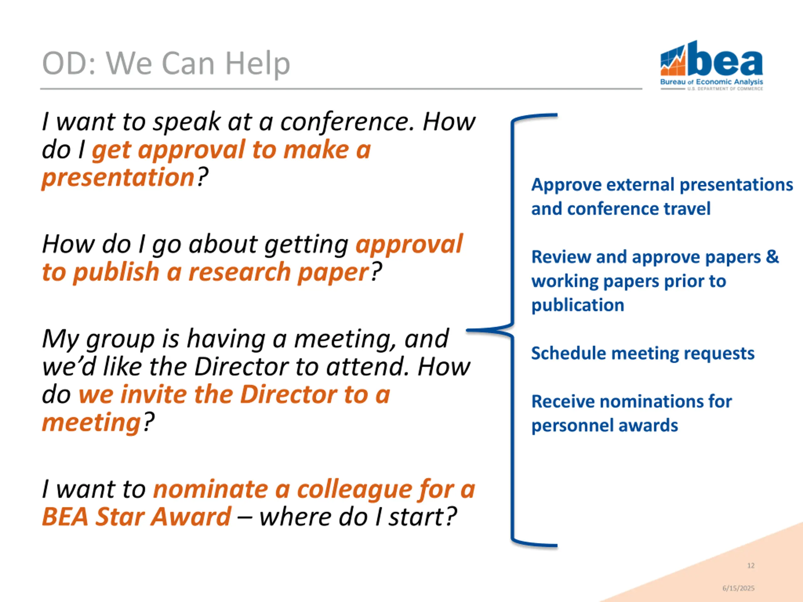 OD: We Can Help I want to speak at a conference. How do I get approval to make a presentation? Approve external presentations and conference travel How do I go about getting approval to publish a research paper? Review and approve papers & working papers prior to publication My group is having a meeting, and we d like the Director to attend. How do we invite the Director to a meeting? Schedule meeting requests Receive nominations for personnel awards I want to nominate a colleague for a BEA Star Award where do I start? 12 6/15/2025
