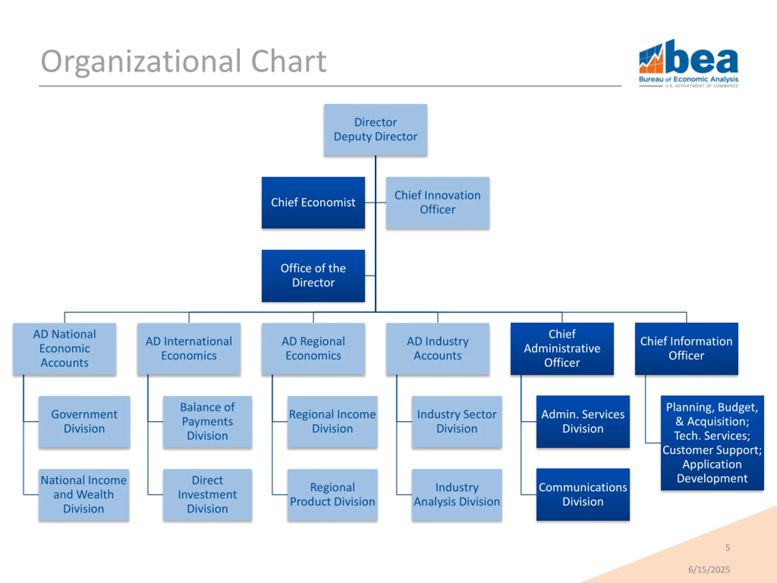Organizational Chart Director Deputy Director Chief Innovation Officer Chief Economist Office of the Director AD National Economic Accounts Chief AD International Economics AD Regional Economics AD Industry Accounts Chief Information Officer Administrative Officer Balance of Payments Division Planning, Budget, & Acquisition; Tech. Services; Customer Support; Application Development Government Division Regional Income Division Industry Sector Division Admin. Services Division National Income and Wealth Division Direct Investment Division Regional Product Division Industry Analysis Division Communications Division 5 6/15/2025