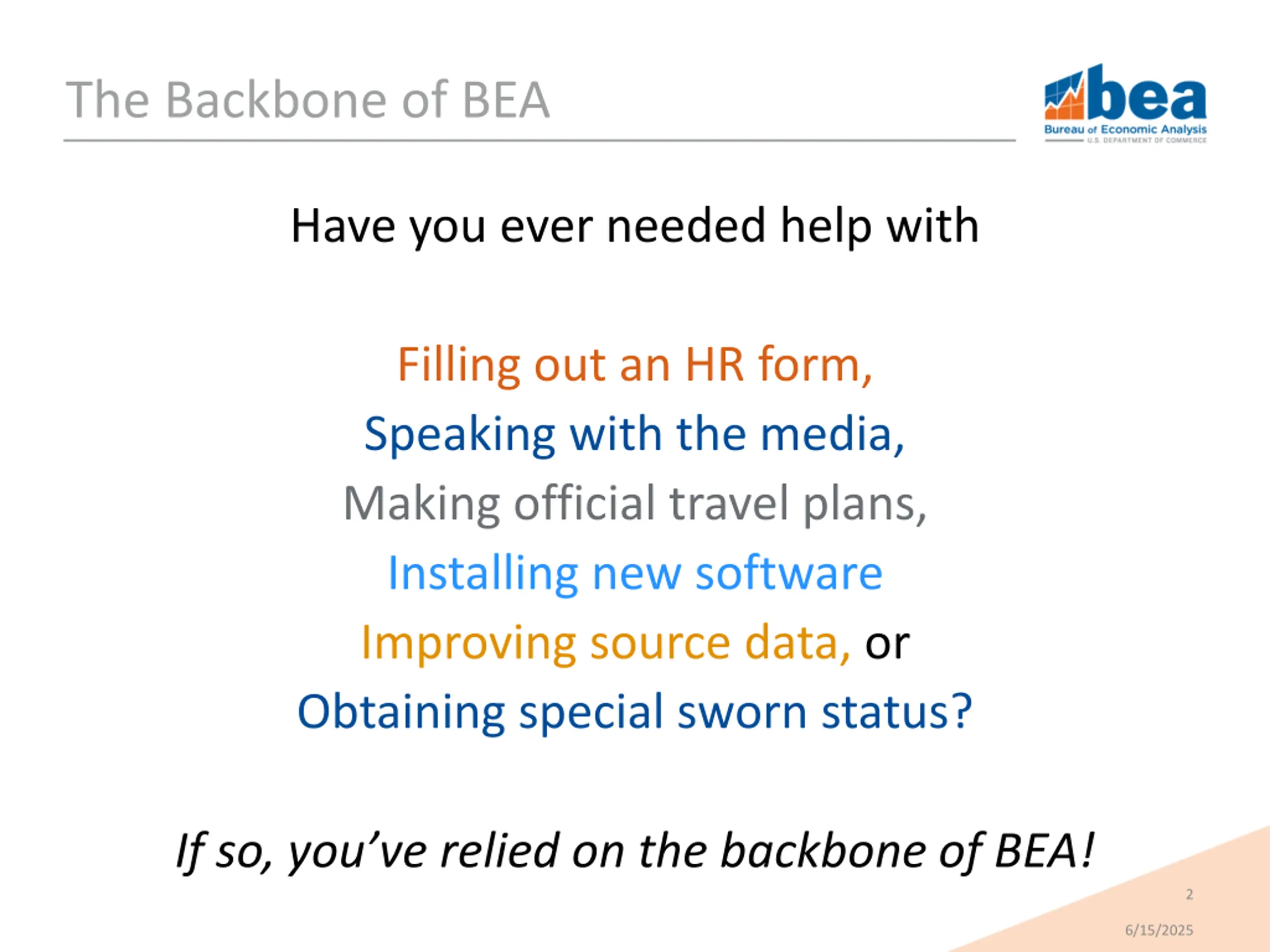 The Backbone of BEA Have you ever needed help with Filling out an HR form, Speaking with the media, Making official travel plans, Installing new software Improving source data, or Obtaining special sworn status? If so, you ve relied on the backbone of BEA! 2 6/15/2025