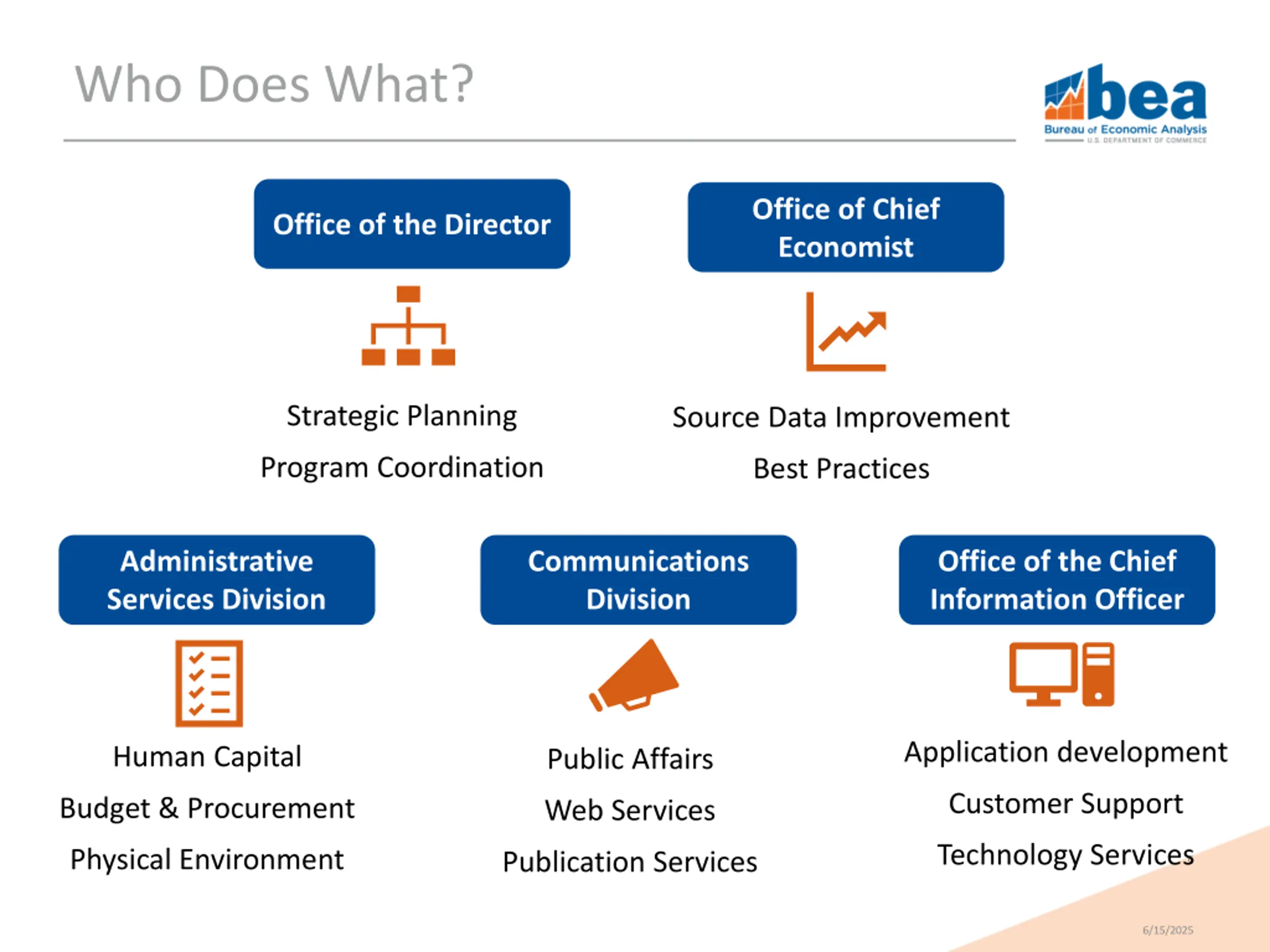 Who Does What? Office of Chief Economist Office of the Director Strategic Planning Source Data Improvement Program Coordination Best Practices Administrative Services Division Communications Division Office of the Chief Information Officer Application development Human Capital Public Affairs Customer Support Budget & Procurement Web Services Technology Services Physical Environment Publication Services 6 6/15/2025