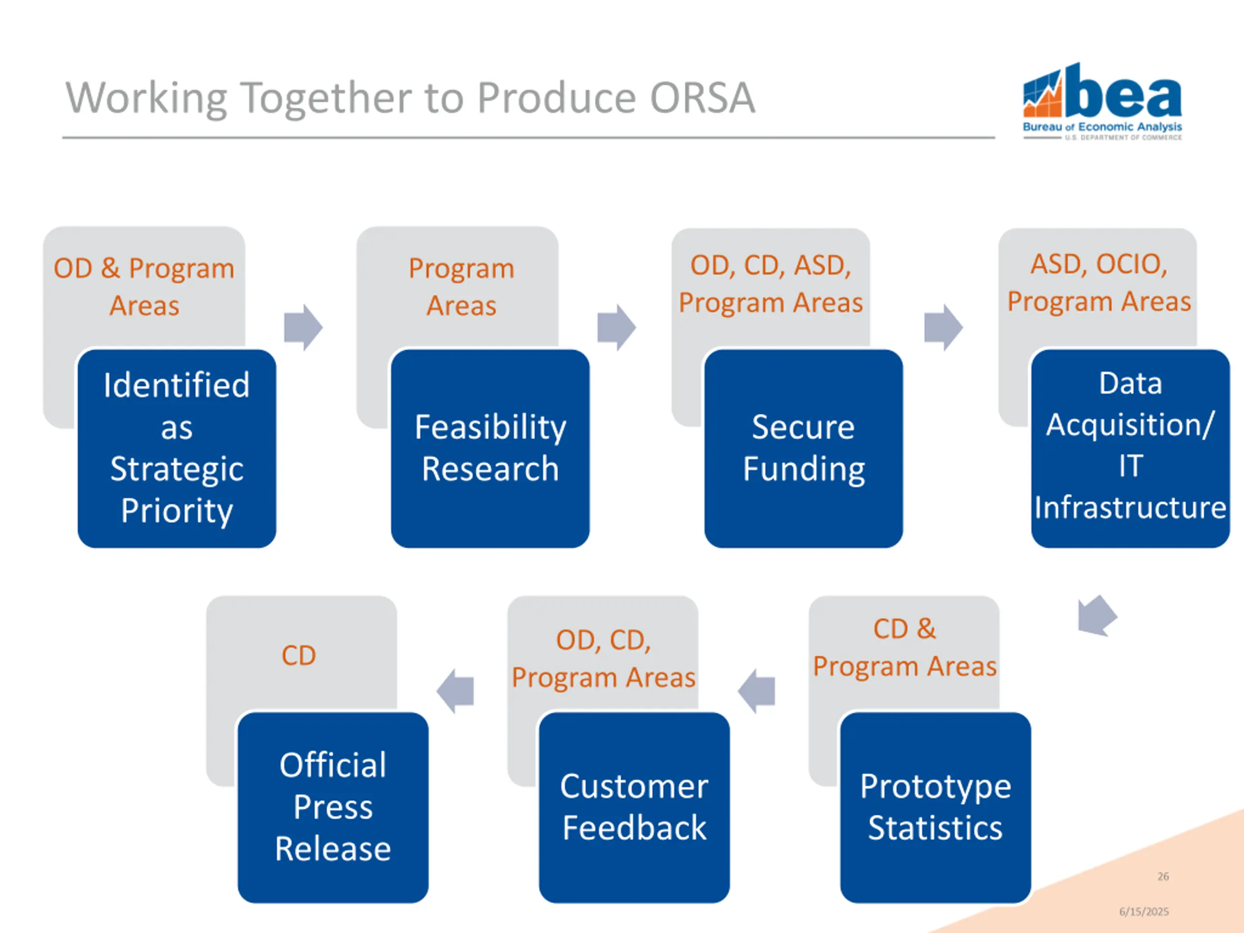 Working Together to Produce ORSA ASD, OCIO, Program Areas OD, CD, ASD, Program Areas OD & Program Areas Program Areas Data Identified as Strategic Priority Acquisition/ IT Infrastructure Feasibility Research Secure Funding CD & OD, CD, Program Areas CD Program Areas Official Press Release Customer Feedback Prototype Statistics 26 6/15/2025