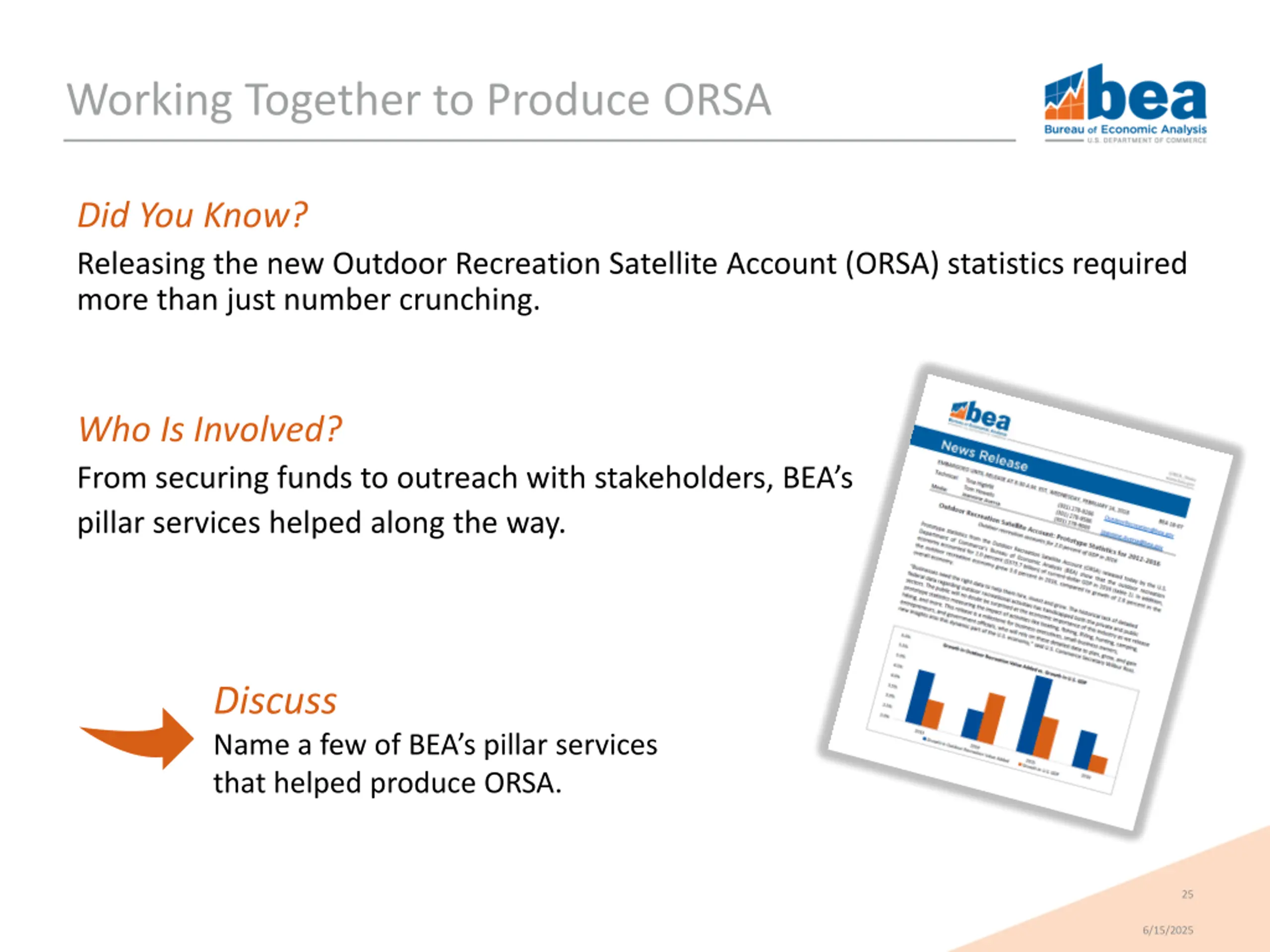 Working Together to Produce ORSA Did You Know? Releasing the new Outdoor Recreation Satellite Account (ORSA) statistics required more than just number crunching. Who Is Involved? From securing funds to outreach with stakeholders, BEA s pillar services helped along the way. Discuss Name a few of BEA s pillar services that helped produce ORSA. 25 6/15/2025