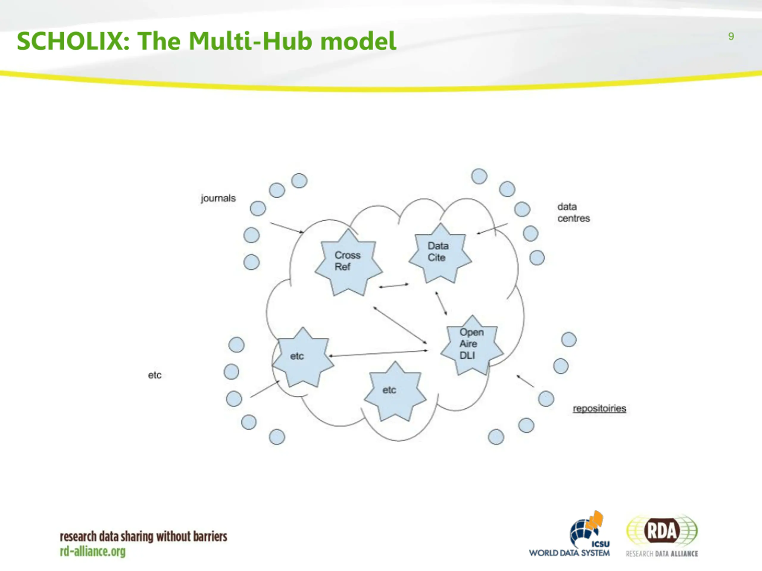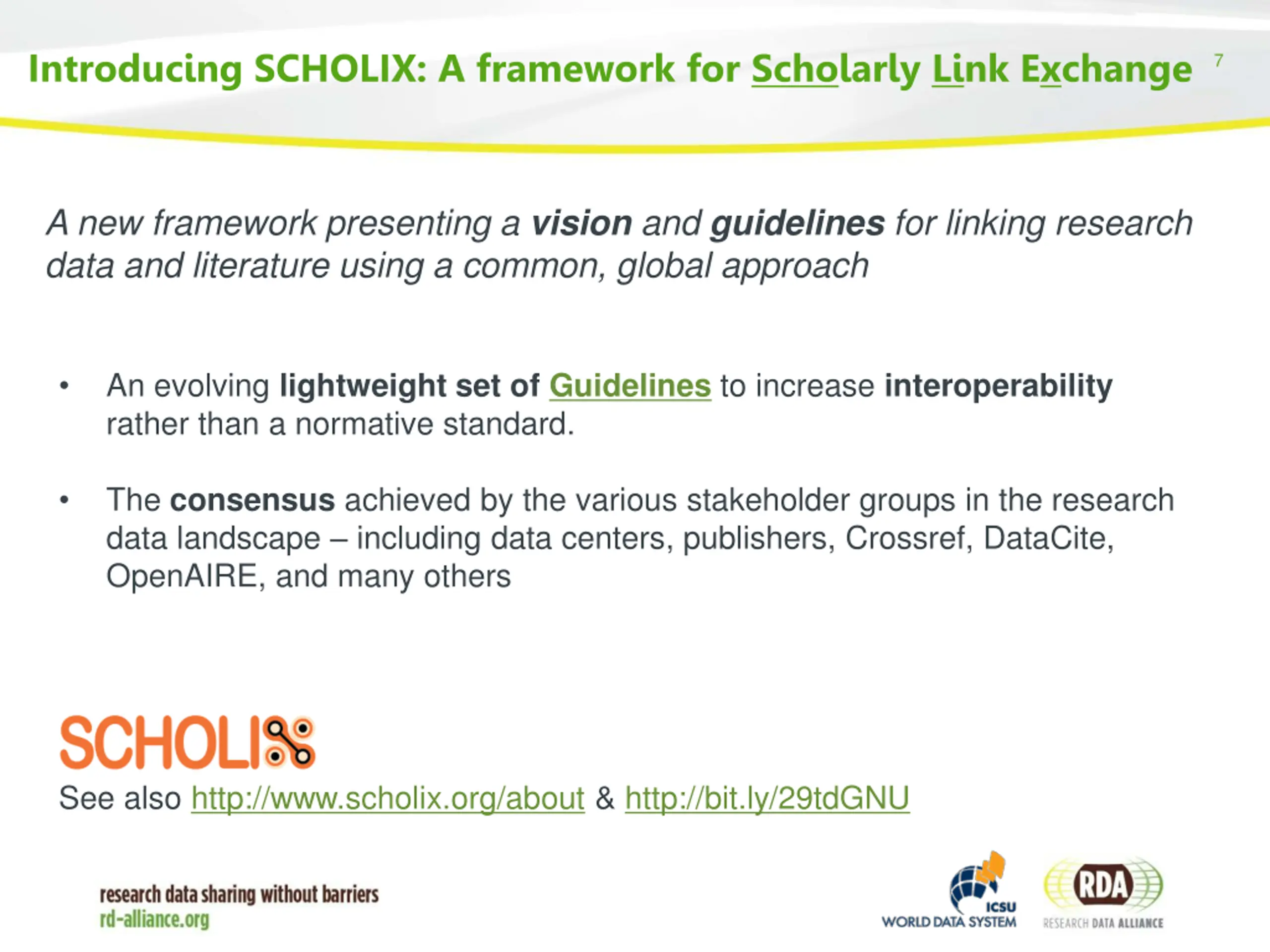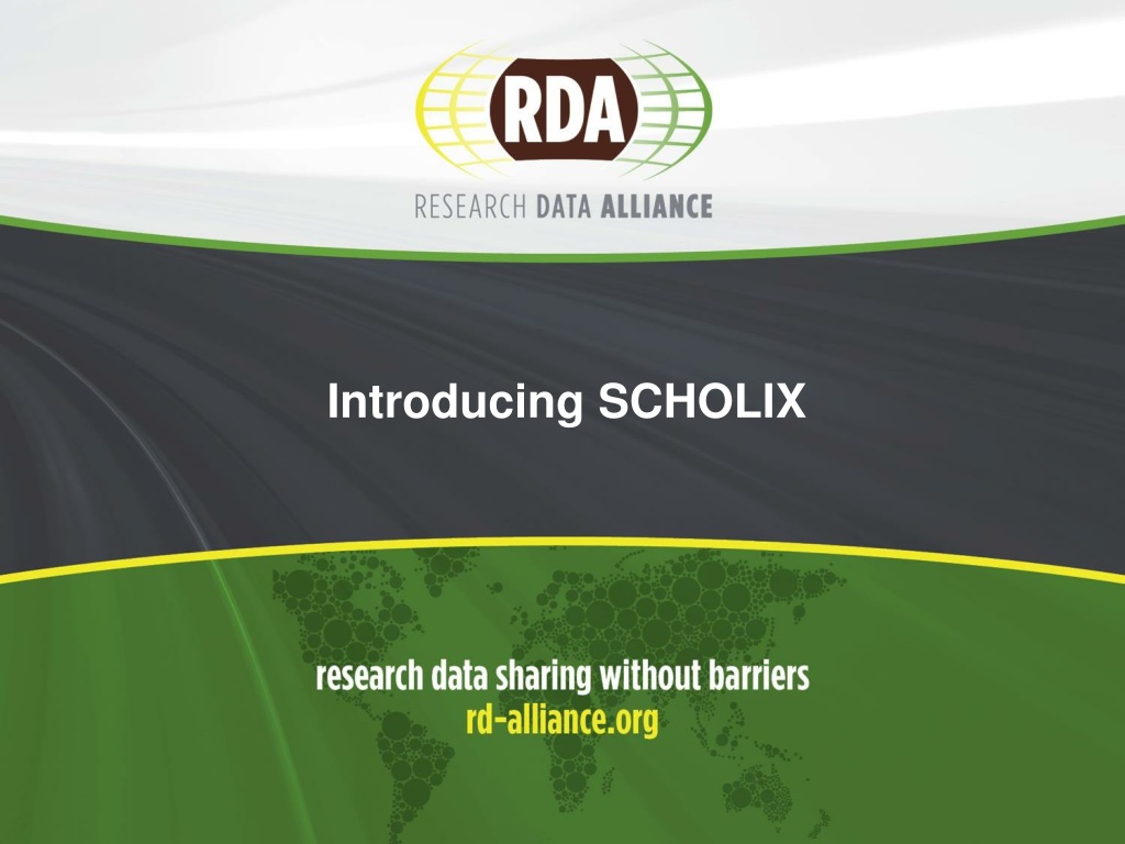 The Data Publishing Services WG 2 Joint ICSU-WDS & RDA Working Group, focusing on linking up research data and the literature Bringing together different stakeholders in the data publication landscape: data centers, publishers, institutional repositories, service & infrastructure providers, Data Literature Interlinking Service (with OpenAIRE & PANGAEA) including 1M+ links from various sources SCHOLIX Guidelines
