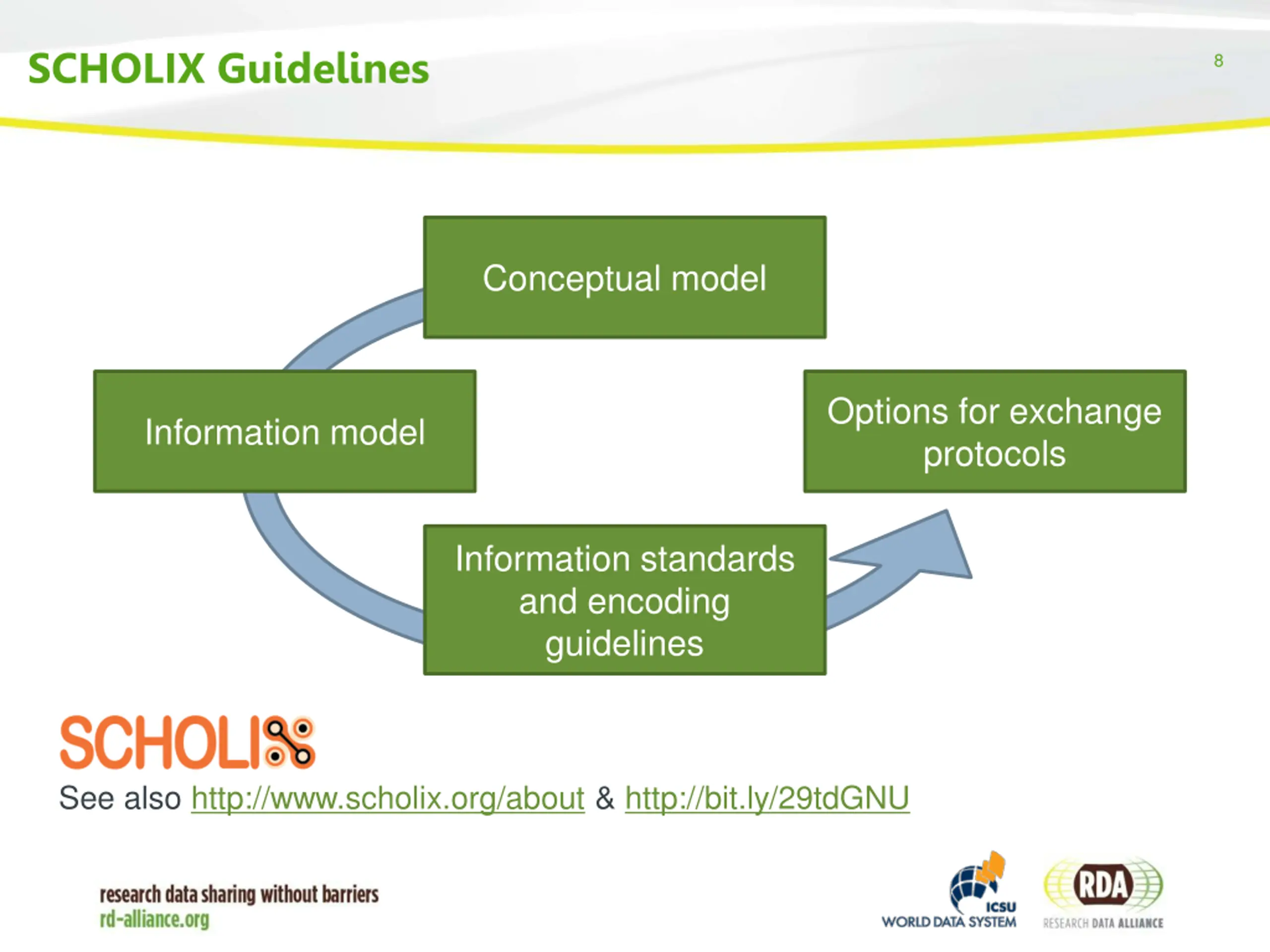SCHOLIX Guidelines 8 Conceptual model Options for exchange protocols Information model Information standards and encoding guidelines See also http://www.scholix.org/about & http://bit.ly/29tdGNU