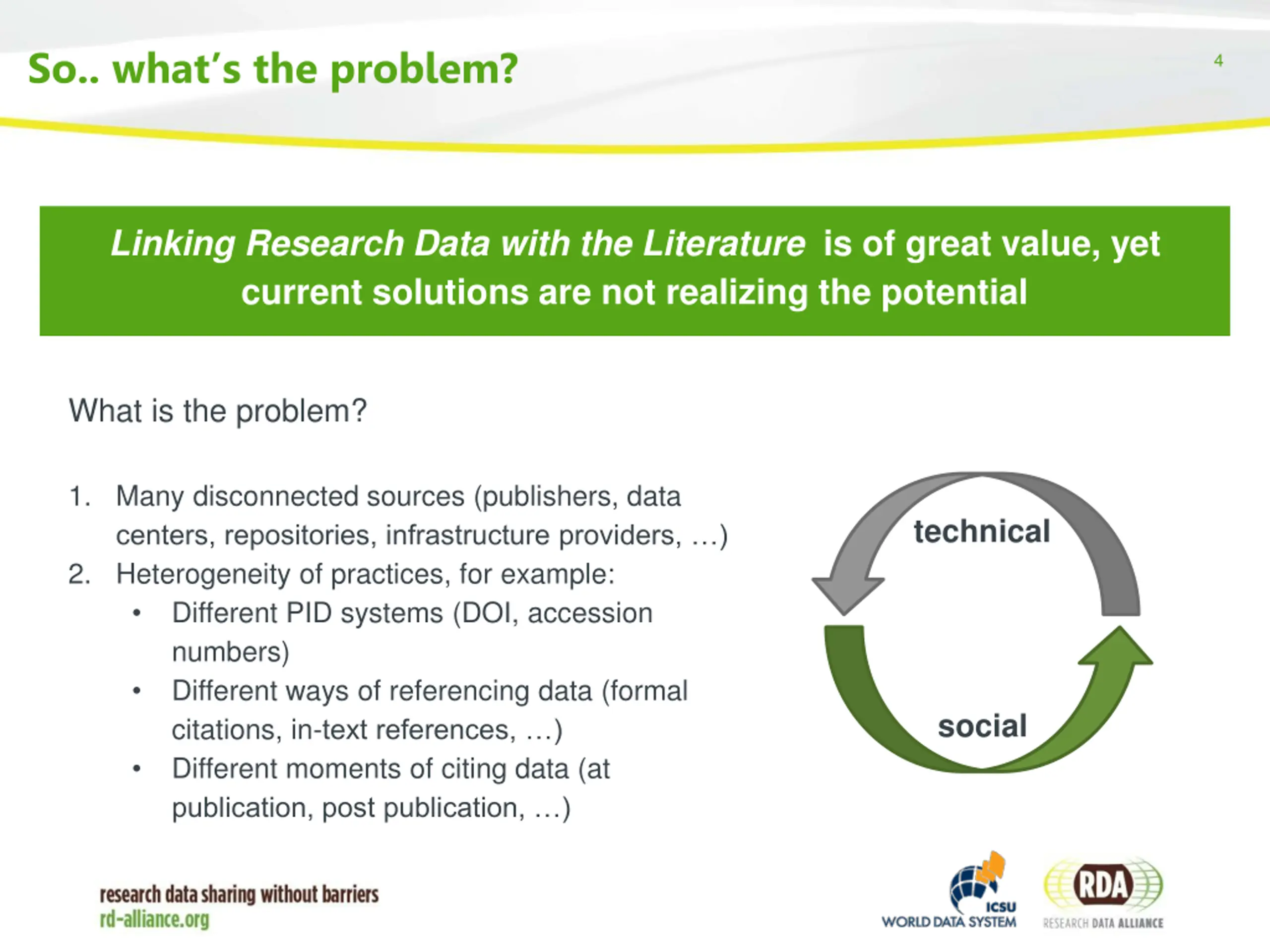 Linking Research Data and the Literature: why? 3 Linking Research Data with the Literature is of great value, yet current solutions are not realizing the potential Why link? Examples Some data repositories keep track of articles that cite, or refer to, their data Some publishers have applications to link articles with data hosted externally Providers of bibliographic information and infrastructure providers are taking efforts to connect the dots 1. Increase visibility & discoverability of research data (and articles) 2. Place research data in the right context to enable proper re-use. 3. Support credit attribution mechanisms
