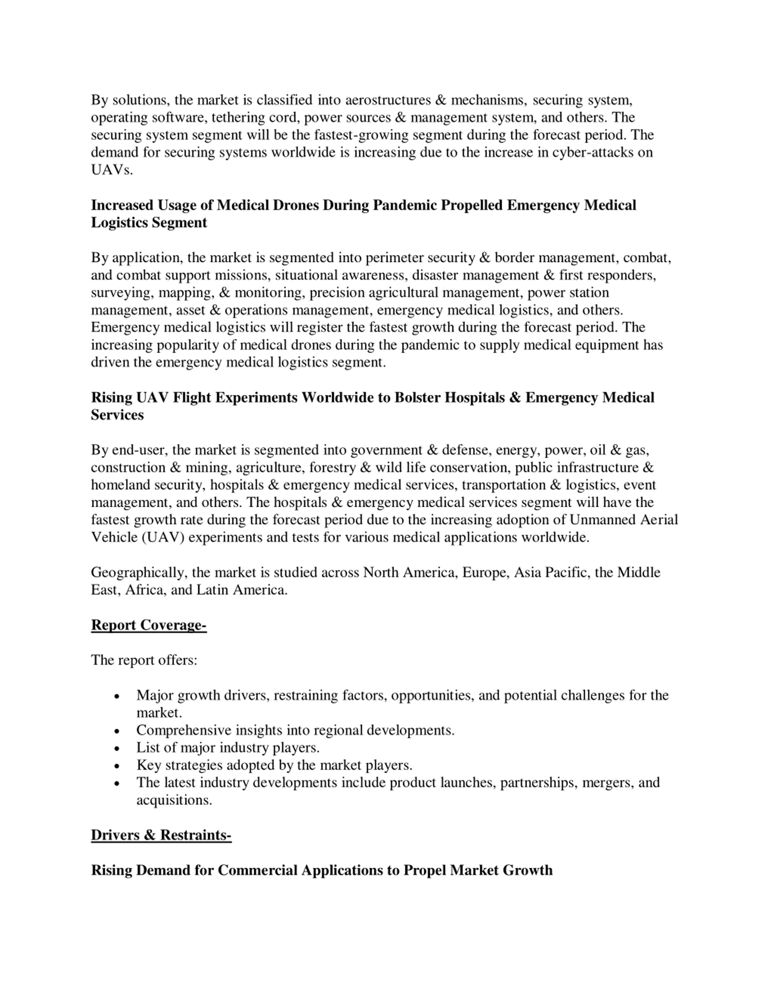 By solutions, the market is classified into aerostructures & mechanisms, securing system, operating software, tethering cord, power sources & management system, and others. The securing system segment will be the fastest-growing segment during the forecast period. The demand for securing systems worldwide is increasing due to the increase in cyber-attacks on UAVs. Increased Usage of Medical Drones During Pandemic Propelled Emergency Medical Logistics Segment By application, the market is segmented into perimeter security & border management, combat, and combat support missions, situational awareness, disaster management & first responders, surveying, mapping, & monitoring, precision agricultural management, power station management, asset & operations management, emergency medical logistics, and others. Emergency medical logistics will register the fastest growth during the forecast period. The increasing popularity of medical drones during the pandemic to supply medical equipment has driven the emergency medical logistics segment. Rising UAV Flight Experiments Worldwide to Bolster Hospitals & Emergency Medical Services By end-user, the market is segmented into government & defense, energy, power, oil & gas, construction & mining, agriculture, forestry & wild life conservation, public infrastructure & homeland security, hospitals & emergency medical services, transportation & logistics, event management, and others. The hospitals & emergency medical services segment will have the fastest growth rate during the forecast period due to the increasing adoption of Unmanned Aerial Vehicle (UAV) experiments and tests for various medical applications worldwide. Geographically, the market is studied across North America, Europe, Asia Pacific, the Middle East, Africa, and Latin America. Report Coverage- The report offers: Major growth drivers, restraining factors, opportunities, and potential challenges for the market. Comprehensive insights into regional developments. List of major industry players. Key strategies adopted by the market players. The latest industry developments include product launches, partnerships, mergers, and acquisitions. Drivers & Restraints- Rising Demand for Commercial Applications to Propel Market Growth