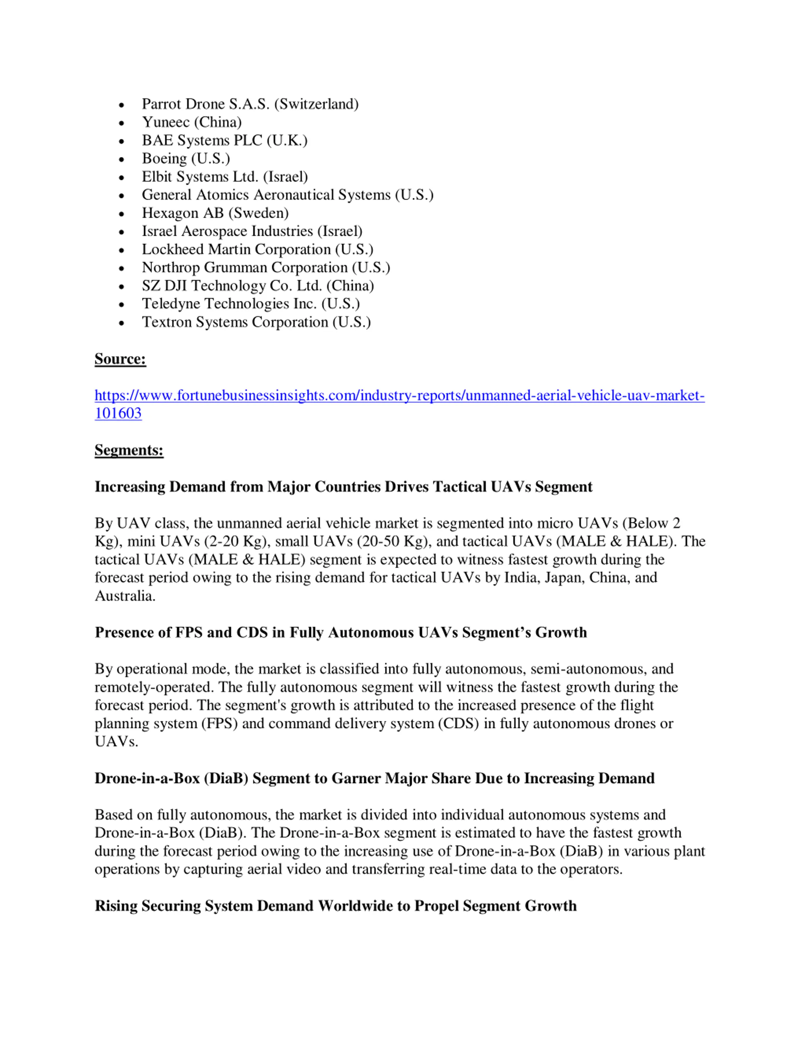 Parrot Drone S.A.S. (Switzerland) Yuneec (China) BAE Systems PLC (U.K.) Boeing (U.S.) Elbit Systems Ltd. (Israel) General Atomics Aeronautical Systems (U.S.) Hexagon AB (Sweden) Israel Aerospace Industries (Israel) Lockheed Martin Corporation (U.S.) Northrop Grumman Corporation (U.S.) SZ DJI Technology Co. Ltd. (China) Teledyne Technologies Inc. (U.S.) Textron Systems Corporation (U.S.) Source: https://www.fortunebusinessinsights.com/industry-reports/unmanned-aerial-vehicle-uav-market- 101603 Segments: Increasing Demand from Major Countries Drives Tactical UAVs Segment By UAV class, the unmanned aerial vehicle market is segmented into micro UAVs (Below 2 Kg), mini UAVs (2-20 Kg), small UAVs (20-50 Kg), and tactical UAVs (MALE & HALE). The tactical UAVs (MALE & HALE) segment is expected to witness fastest growth during the forecast period owing to the rising demand for tactical UAVs by India, Japan, China, and Australia. Presence of FPS and CDS in Fully Autonomous UAVs Segment s Growth By operational mode, the market is classified into fully autonomous, semi-autonomous, and remotely-operated. The fully autonomous segment will witness the fastest growth during the forecast period. The segment's growth is attributed to the increased presence of the flight planning system (FPS) and command delivery system (CDS) in fully autonomous drones or UAVs. Drone-in-a-Box (DiaB) Segment to Garner Major Share Due to Increasing Demand Based on fully autonomous, the market is divided into individual autonomous systems and Drone-in-a-Box (DiaB). The Drone-in-a-Box segment is estimated to have the fastest growth during the forecast period owing to the increasing use of Drone-in-a-Box (DiaB) in various plant operations by capturing aerial video and transferring real-time data to the operators. Rising Securing System Demand Worldwide to Propel Segment Growth